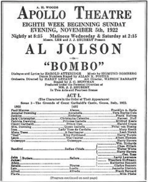 If that’s the case, or something like that, I’m wondering if there isn’t a time travel element (like, maybe a leap forward into modern day America), since a lot of the song names suggest that America has already been discovered and colonized (Tallahassee, Wetona, California Here I Come). Oh, actually, I just found this playbill, which shows that the cast play characters in “1922” (the year that the playbill is from, so it was probably “1921” in 1921 – yes, I’ve confirmed this now) and in “1492”. And this all takes place in “ACT I”, so perhaps the bulk of the story is in the modern day (another line on the bill says that the play is “In Two Acts”). You might notice that the show went on at the Apollo Theatre, but you might almost overlook the fact that one of Jolson’s co-stars (playing an “Indian Chief”) was named Walter White (Vince Gilligan, the creator of Breaking Bad, openly admits to being influenced by The Shining).