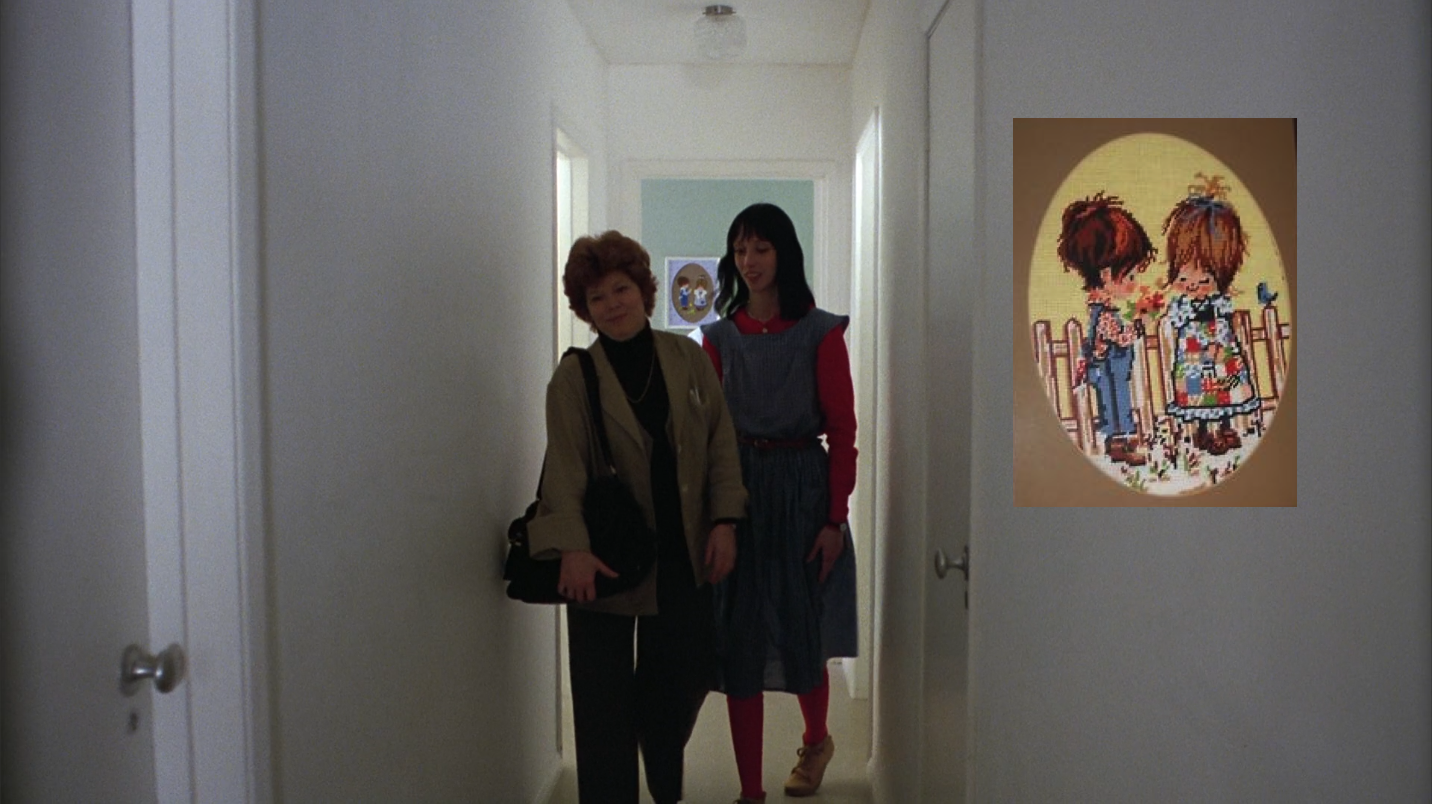 This could be interpreted a few ways, but I like to think it’s simply to remind of Danny’s vision of the twins from moments ago. Since Danny gets his vision from Tony while staring in the direction of this knitting, it seems to slightly undermine the veracity of Tony’s psychic power. A highly perceptive audience member might’ve thought, “Oh. That’s where he got the white-and-blue twins from. The wall knitting.” But just as Woman and Terrier foreshadows Danny’s neck bruises, this foreshadows the return of the twins, just as Horse and Train foreshadows… but we’ll get to that.