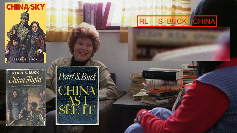 China Sky seems to be the likeliest book (considered one of Buck’s classics), if it was meant to be only one of the three. It concerns an American doctor, the head of a hospital he built in China, and a series of wartime complications involving other Asian and American doctors. Very doctor-heavy. But more interestingly, the 1945 film version, starred the same lead as the film that plays in this room, earlier, Randolph Scott (Carson City). The two films have no other major connection I can see (other than the odd note that both featured a cast member named Thurston), but still. The film also stars Mrs. Citizen Kane herself, Ruth Warrick, which is probably coincidence, but could be Kubrick’s stunningly subtle way of implying he saw The Shining as his masterpiece.