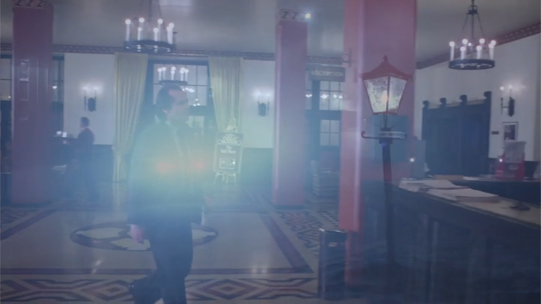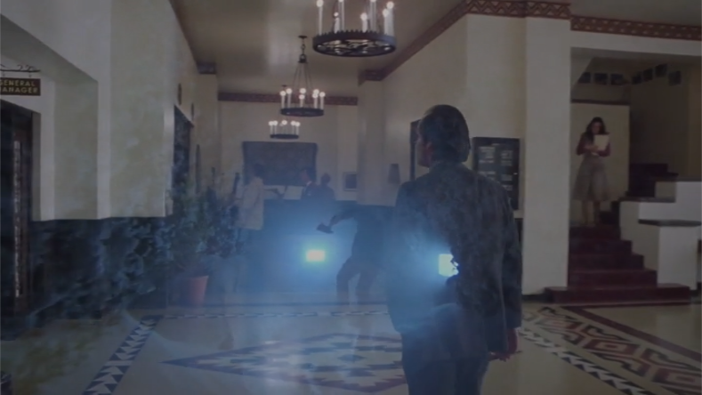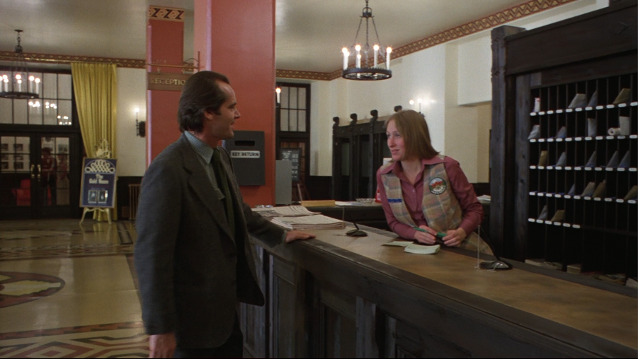 - Incidentally, there’s a male and female hotel employee (you can tell by their uniforms) standing on the other side of the glass doors behind Jack here, and I’ve often wondered if they’re actors from something else that inspired the film. If so, this moment would be extra juicy, since they’re standing in the beam of light (see below).