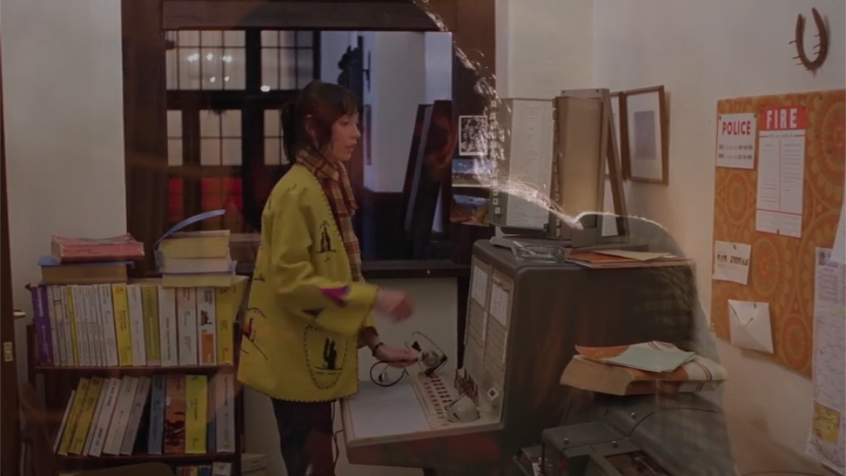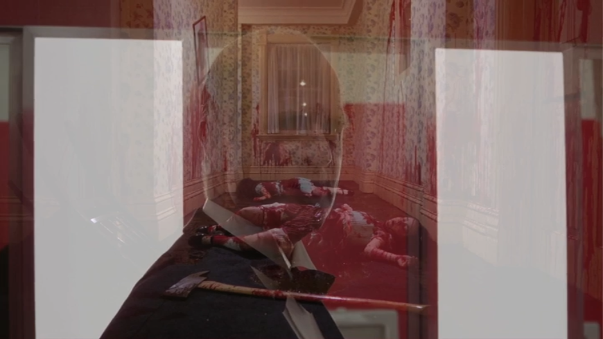 - One last paranoid thought: of all the phone books behind Wendy here, only one (that I can make out) isn’t for an American location. It’s for Buenos Aires, the capital of Argentina. This happens to be the place that Hitler was thought to have escaped to following the collapse of his war plans. And if you accept the notion that the photo Jack crossfade (seen below) creates a Hitler moustache on the larger face, then the black and white collage here could also be a Hitler reference. And just for fun I’ll point out that Hitler is theorized to have escaped Germany by U-boat, and, yeah, there’s a giant U in the upper right corner here (where a “cigarette burn” would appear). This is certainly a conspiracy theory, as recent science has shown. But perhaps there’s some kind of truth buried in it. Like, perhaps Kubrick felt that there was too much suspicion surrounding the theory for it to be whole cloth (and we know that some nazis vanished into the mists of time). In his interview with Michael Ciment, Kubrick confesses to believing that psychic abilities will one day be proven true, and if this wasn’t more smoke-screening, then we can infer that the genius director had a powerful imagination, and didn’t use science as a stick to beat all the creativity out of the world. But if we’ve got Hitler’s teeth, then we’ve got his teeth, you know? It’s just that we didn’t have them in 1979.