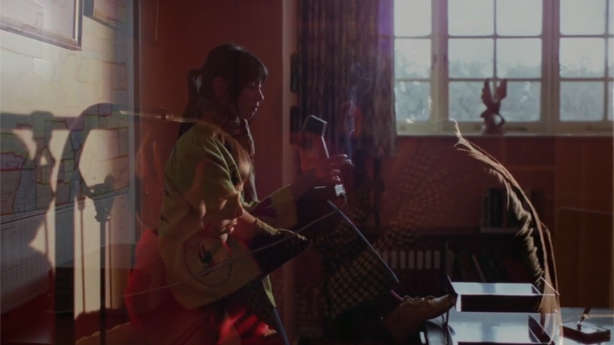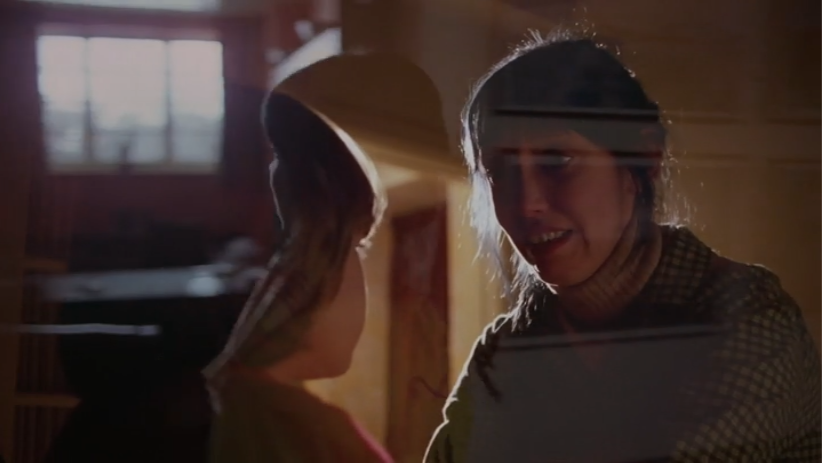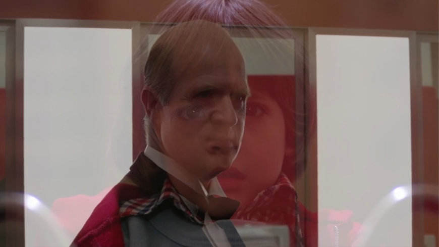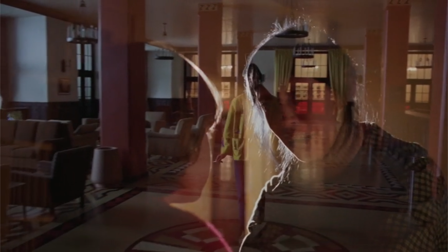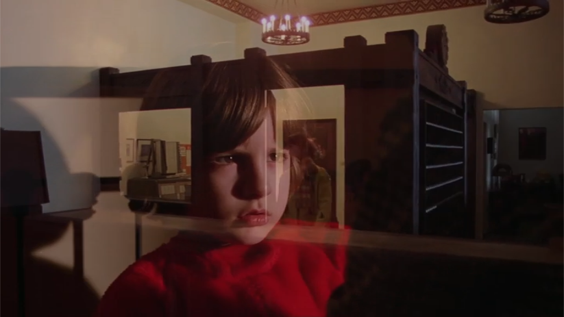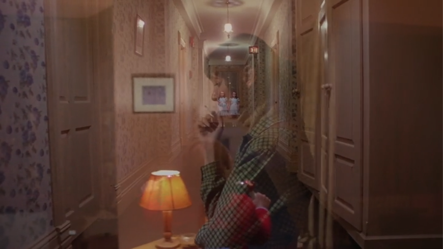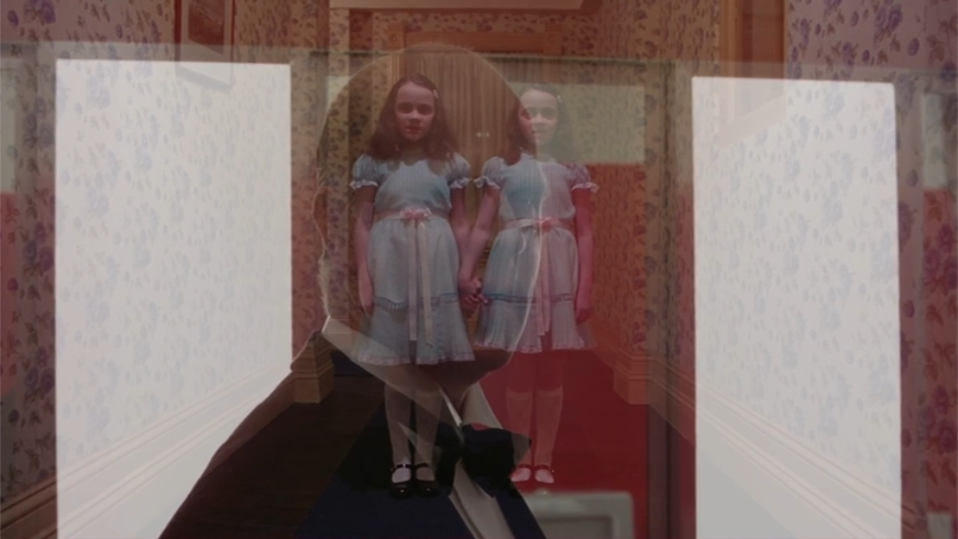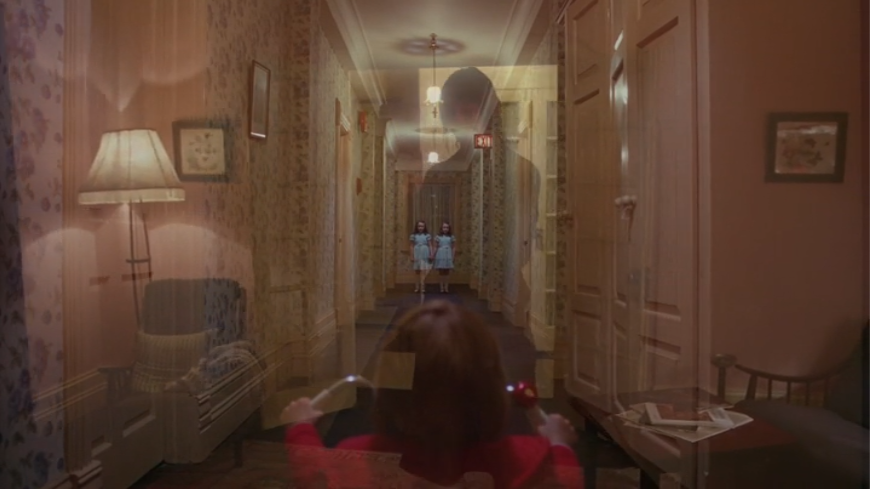 - “He rollercoaster” – Mirror Grady appears on “coast”. The syllable “coast”, however, sounds a bit like “ghost” the way Lennon says it. The last time we heard this, we had just cut to the first shot of the Overlook from the air. And here we get the first mirrorform shot of the Grady family ghosts all together now. (Of course, none of the ghosts are who they seem to be: this ghost is Delbert Grady, while Jack heard about a Charles Grady, and the twins are twins instead of “about 8 and 10” as Ullman described them. So these are not actual ghosts, they’re projections of the hotel.)