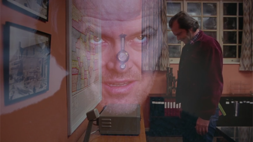 - This shot also contains the “He rollercoaster” lyric, and doesn’t quite have the same punch as the last two rounds, which both revealed a haunted thing we hadn’t seen before. This is the last shot of Jack writing overlaying with the first scene of him writing. And in round 2, the moment is the first (mirrorform) time Delbert Grady is seen in the film overlaying with the last time the Grady twins are seen by Danny. And in round 1, it’s the first shot of the hotel exterior overlaying with the last shot of Danny and Wendy driving past the exterior during their escape. So I guess the roller”ghost”er was about firsts and lasts for spooky nemeses.