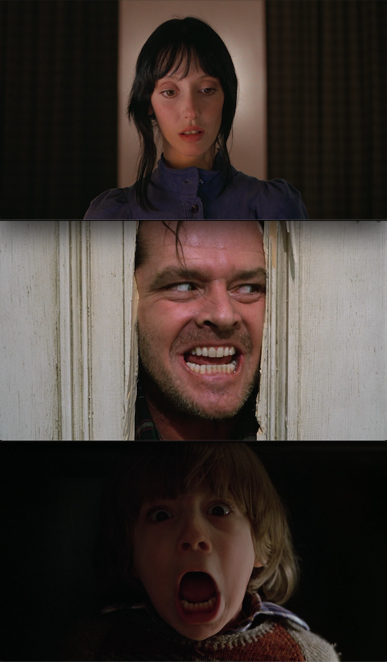 There’s three instances of someone’s face being centred in isolation, almost like three flags. Each member of the family gets one. Wendy’s looks most like a zoomed-in-on Arapahoe flag, while Jack’s is like a white flag, and Danny’s a black flag.