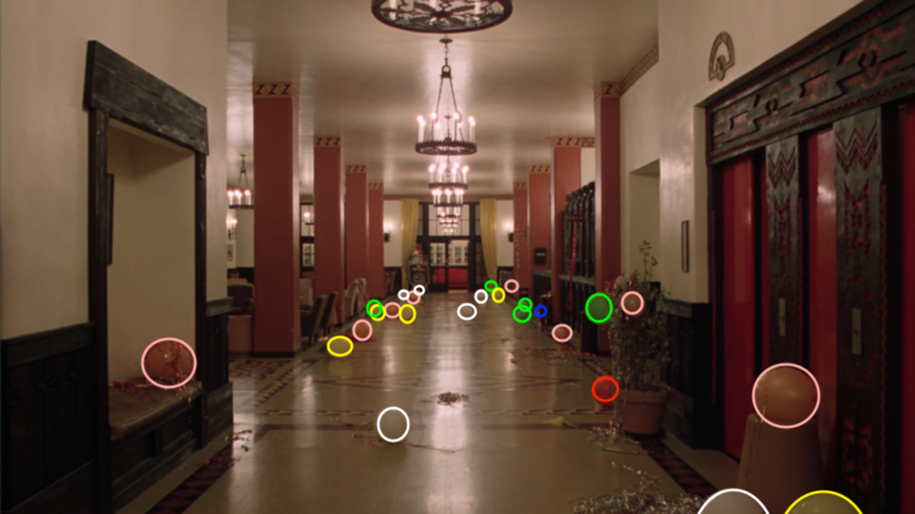 Actually, the 2nd and 3rd couches are the most similar of those, while the 1st and 4th chair circles are the most similar of those. But if we think of the 1st and 4th chair circles as the 4th and 7th overall sets of people sitting, this would mean that the most conformist arrangements (by gender in the couches and by colour in the chairs), are the 2nd, 3rd, 4th, and 7th. That’s like a 42/237 mash-up. Also 23 minutes and 47 seconds into the movie (past the WB logo) is the first second of Jack entering the Gold Room, on the tour (once the fade from the prior scene has faded out completely). Coincidence?