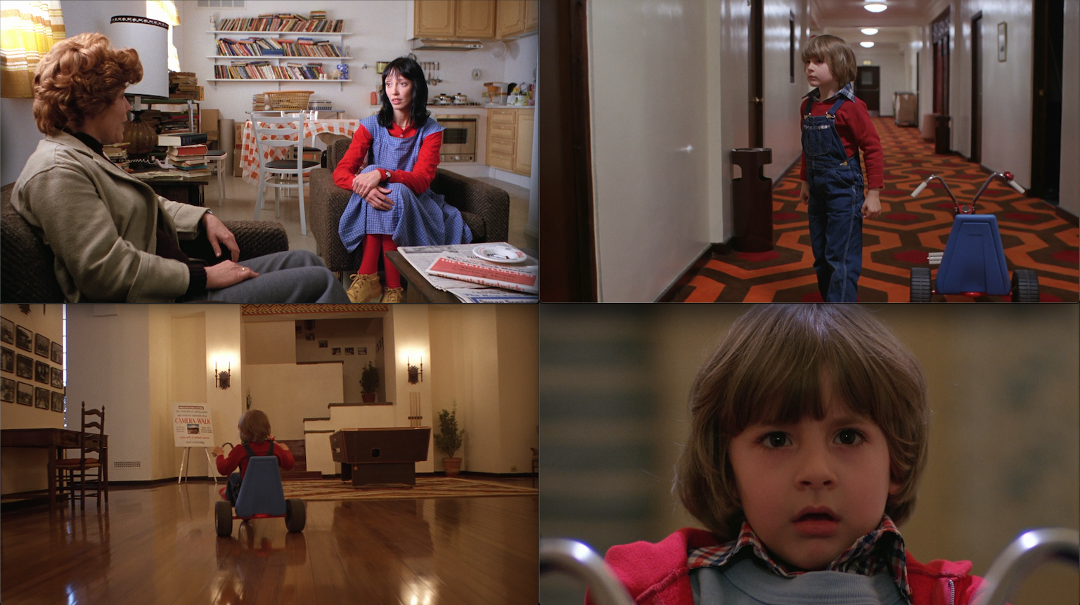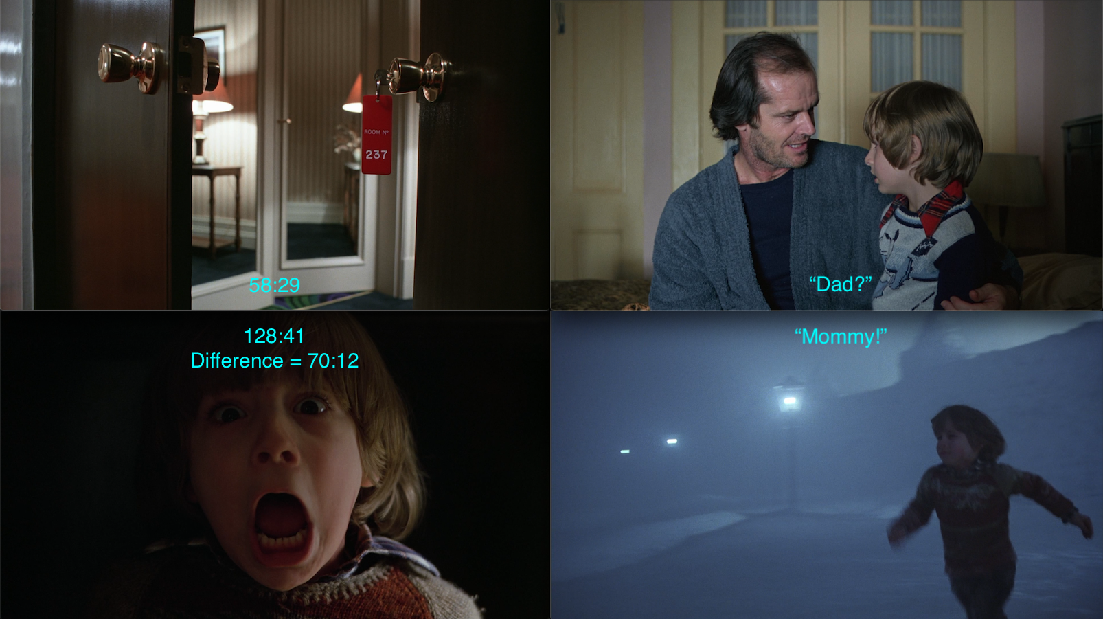 Danny will say almost nothing as Danny for, well, for the entire movie, really. His three big conversations are the doctor interview, the Hallorann interview, and the zombie Jack interview. What’s really spectacular is how in a 141:30 drama, Danny goes 70:12 (almost a perfect half) without speaking a word (as Danny; I’m not counting Tony talk). And all he really says post-scream is calling out for his mommy. He says the word “mom” 11 times before 237 and “mommy” 4.5 times running out of the maze (the fifth time is cut off when he collides with Wendy). He says “dad” 10 times before 237, and 8 of those are in the zombie Jack interview. Next to “redrum” (52) and “yes/yeah” (15) and “no” (7), mom and dad are Danny’s most spoken words.