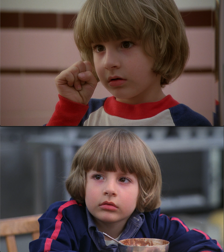 The two breakfasts are notably similar affairs. Actually, I haven’t pointed this out in any of my other comparisons: note how even that green-orange flower-patterned cushion behind early Wendy looks like the starry, flowery green-orange comforter on the bed.