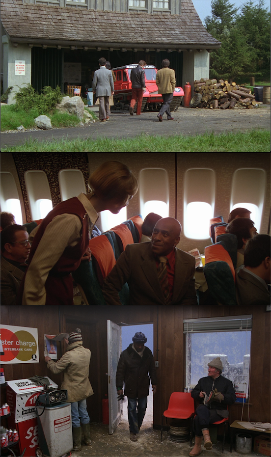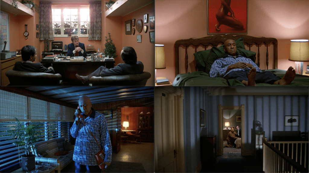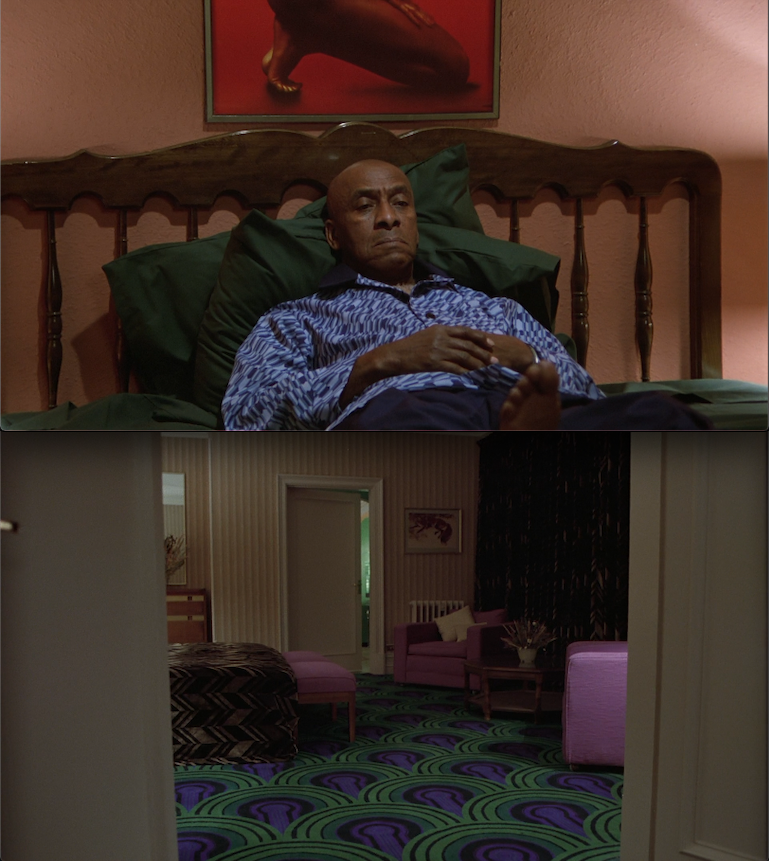 We only see two areas of Hallorann’s Miami flat–the bedroom and the living room/dining room–and both feature colours that are highly reminiscent, if not identical to Ullman’s office and the blowjob well. You’ll notice a few other stylistic similarities between the latter two, not least of which how both areas are chopped up by stripes of light, while both also featuring a distant lamp in an adjoining room.