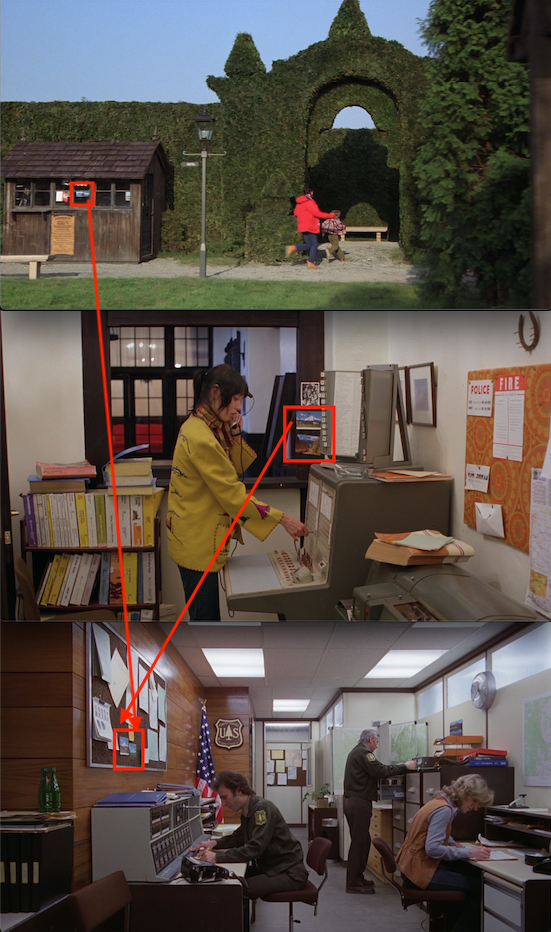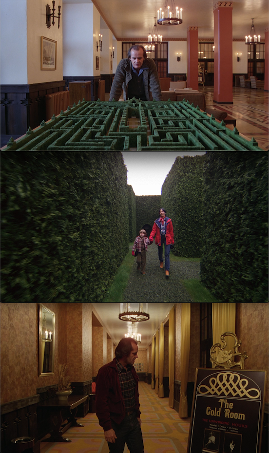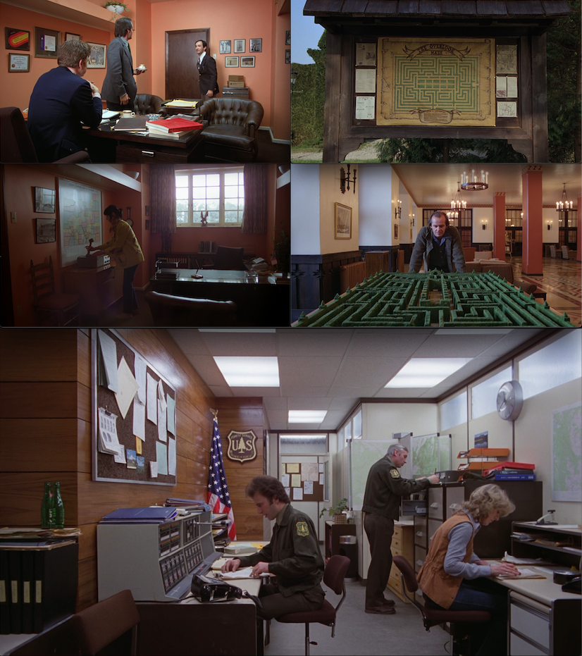 There’s numerous maps presented throughout the film: two in Ullman’s, the migrating one outside the entrance of the labyrinth, the model which reproduces that design, then all the many maps in the US Forest Service and the first radio room Wendy tries. What’s interesting is that at least two of these maps are wrong. The 14th-century map inside Ullman’s, the first ever map of the Americas, looks like a funhouse mirror version of the land as we would come to understand it, and the maze map and model both completely fail to capture the actual layout of the labyrinth, as confirmed by the aerial view. It’s like Kubrick’s saying, maps only get you so far. You’ve got to walk the walk. You’ve gotta get out there and see the world to understand what it really is.