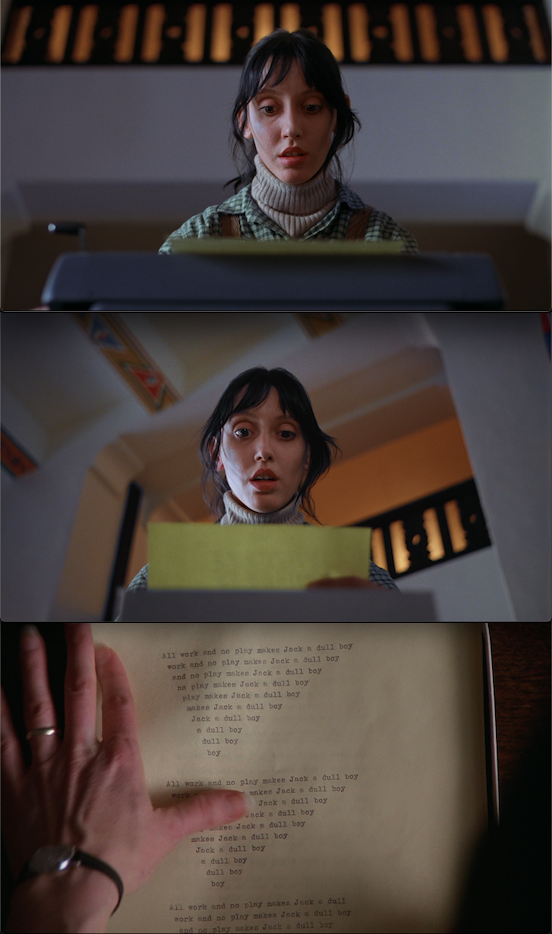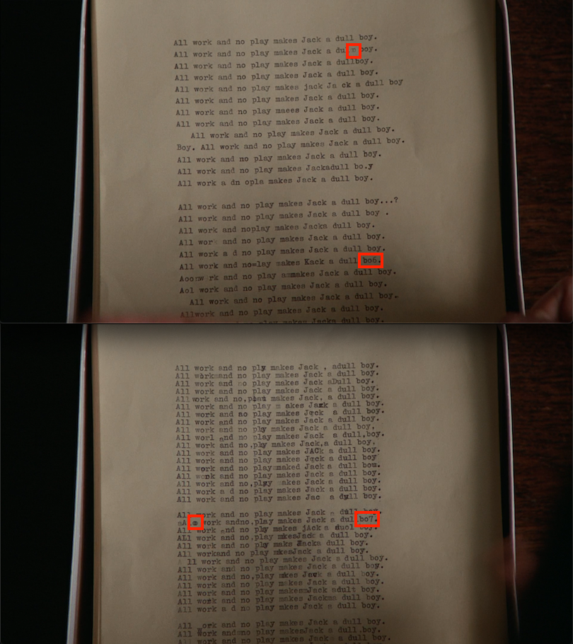 So, if nothing else on this site has convinced you I’m a crazy person, dig this: there are 536 visible lines of “All work and no play makes Jack a dull boy” across the 18 pages we see Wendy look at. At 5:36 into the film Jack says, “I’m a writer” in response to Watson’s question “What line of work are you in now?”