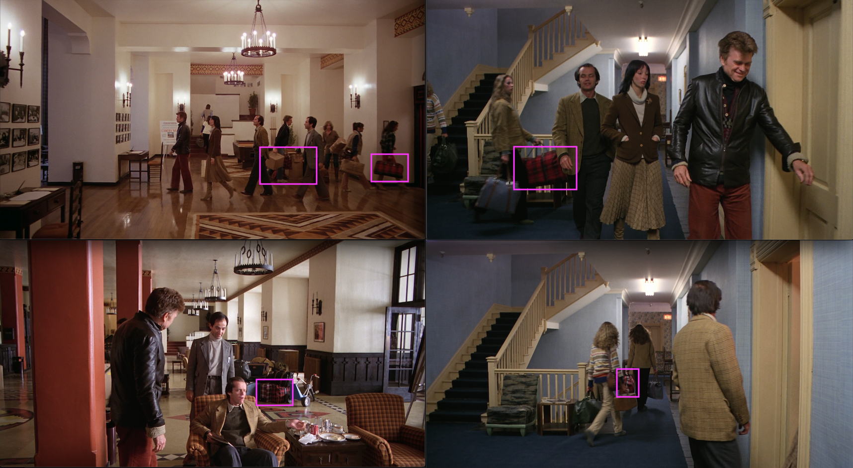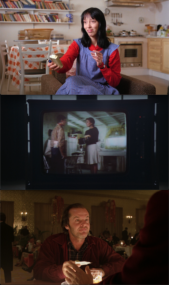 There’s actually a few interesting repeating patterns in the various luggage seen throughout the film, but the one with significance, as discussed elsewhere, is the red plaid bag sitting by Danny’s trike when Ullman and Watson crash Jack’s lunch. As I’ve shown elsewhere, there’s good reason to think this was initially a reference to Jack Nicholson’s role in Easy Rider, where he rides on a motorcycle with a red plaid travel case behind him. I’ve wondered about the various implications of this (a foreshadowing of Jack’s death? a reminder of the actor’s glory days? an invocation of 1969 and the Apollo 11 mission?) but here, as the other red plaid cases are carried out by groups of young people, they seem to be calling out to Jack, who tries to notice them without noticing them. I wonder if this was a subtle way Kubrick was attacking actor Jack’s psyche, to undercut the grandiosity of possibly one of the greatest actors who ever lived, to get a little extra bitterness into this role. Duvall was famously the one that Kubrick targeted openly with head games, but this was possibly part misdirection.