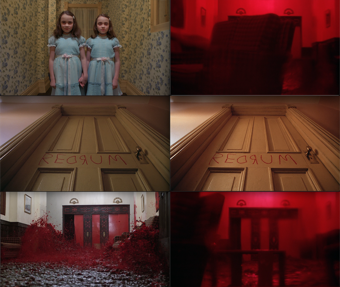 Although this is a subject better discussed in the section focussing on the phenomenon of shining, I thought I would just point out the power that Danny’s shines have to express a pattern. As the bloodfall punches its three holes in the action, we also get the two girls, the one Danny, and then darkness. So the bloodfall doesn’t simply convey the notion of death by way of its bloody nature, but also by the lessening degrees by which life intercuts with it. The blackness at the end is less a shine than a consequence of Danny’s passing out, but still.