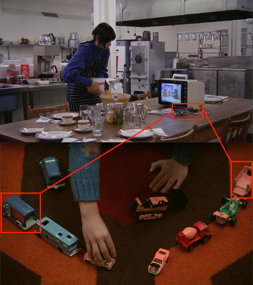 The SWAT van and lorry toys by the TV here reappear when Danny’s outside 237, facing opposite directions as before.