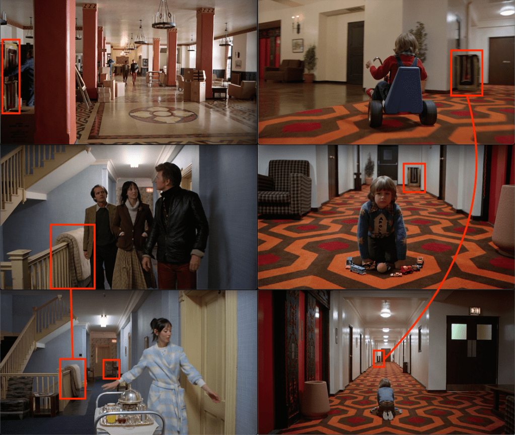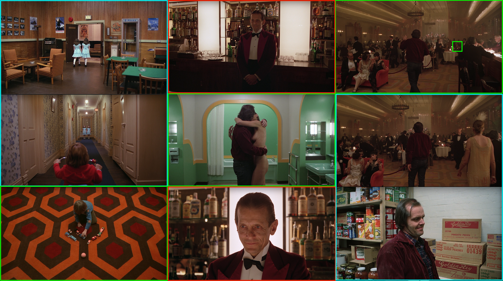The hall leading to the bloodfall, and the hall behind the lobby appear to be the same set redressed to look like different parts of the hotel. It’s possible the crew accidentally built the exact same set twice, but I think a redress is much more likely. This would mean that the door marked “private” next to the bloodfall is the same door that leads into Ullman’s office from behind the lobby.