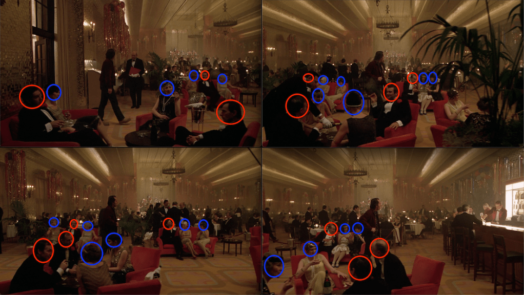 As Jack progresses through the ghostball, there’s three 3-seat couches behind, and four 4-chair chair circles in the foreground. It seems that there’s two ways of analyzing this. First, by colour of outfit, then by gender.