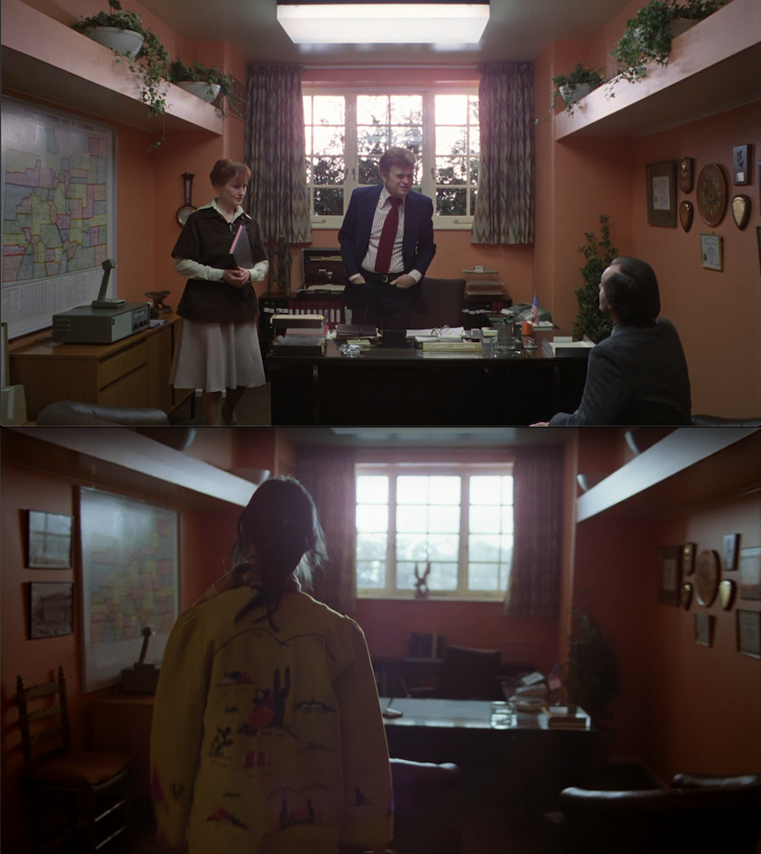 What does it mean? I’m honestly not sure. Maybe it’s to draw attention to the swapping carpets? Maybe it’s to draw attention away from the missing bear rug (and other rugs) in the third shot? The mirrorform doesn’t seem to tell us anything.