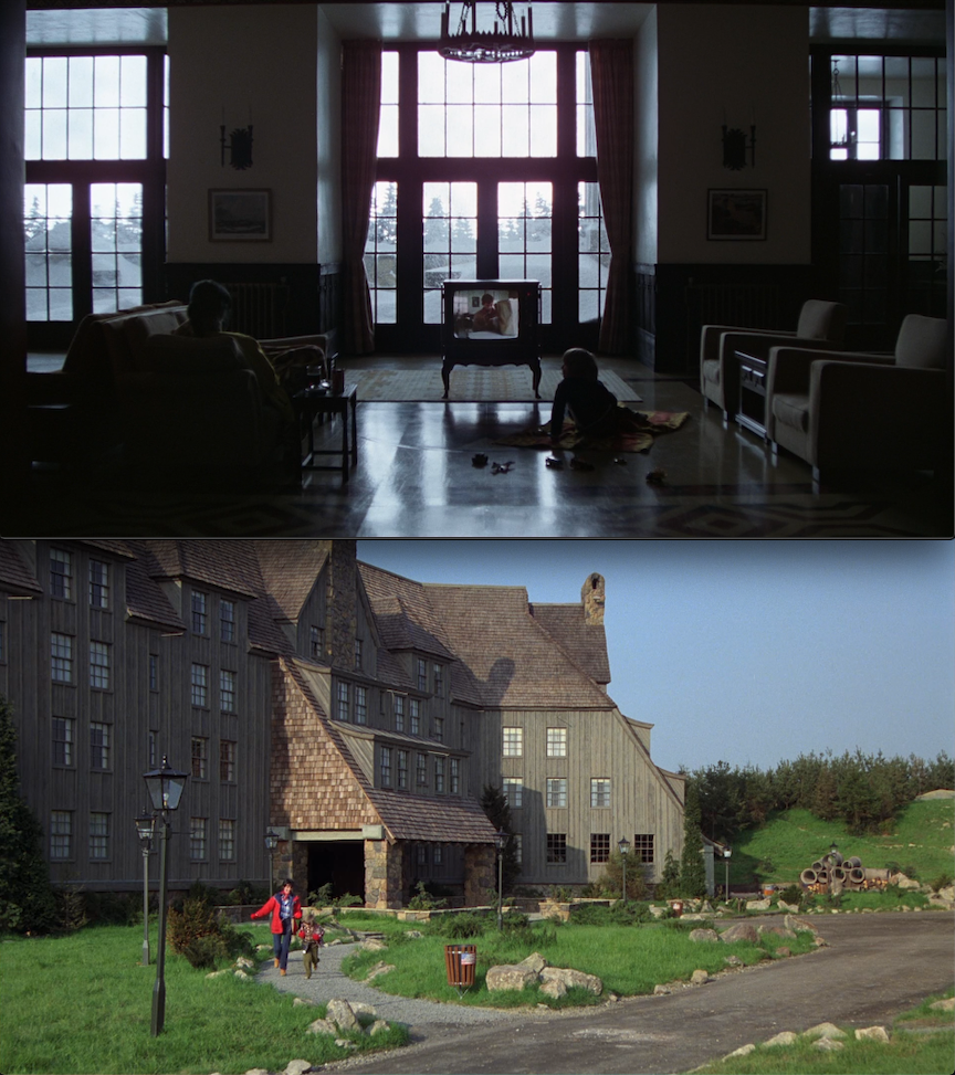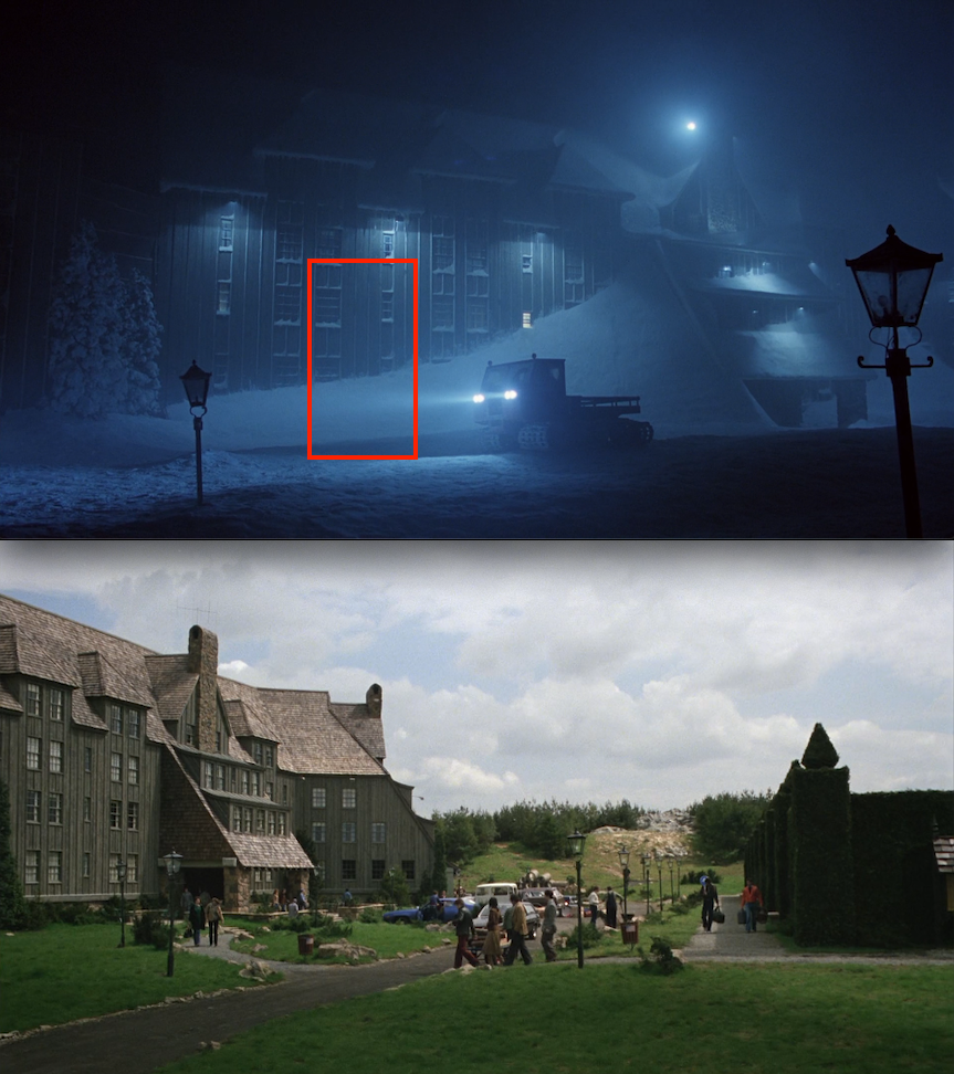 During the Summer of ’42 scene, a blizzard rages outside the windows of the lobby, which looks out directly onto the labyrinth, but the labyrinth cannot be seen. Several large heaps are buried under snow, and there’s a giant roman pillar, presumably holding up the roof of the entrance. In fact, there seems to be a short, raised wall that goes around the whole building, and trees that uniformly line the outside of the Colorado lounge. Seeing the outside of the building, we can see that none of the windows suggested by the Colorado Lounge or the lobby are possible on either Kubrick’s model of the Overlook, or the building used as a reference in the aerial shots. One could argue that the backside of the building would be where these windows are, but if so, both exterior buildings are probably only barely wide enough to fit either the Colorado lounge or the Gold Room. So, given that the buildings are coated with windows, neither room would be able to not have windows on both sides.