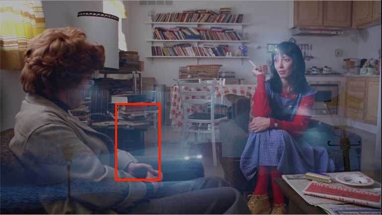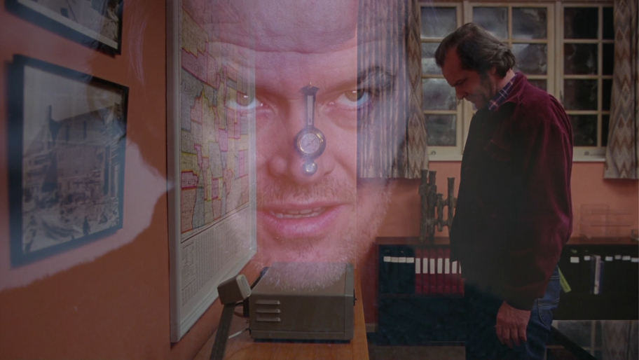 The table and chair behind Jack blip out of existence for one shot during the couple’s first blow out. In the mirrorform, it’s the first shot of the snowcat that Wendy and Danny will escape in. As if Wendy’s getting her first premonition that she needs to get outta Dodge.