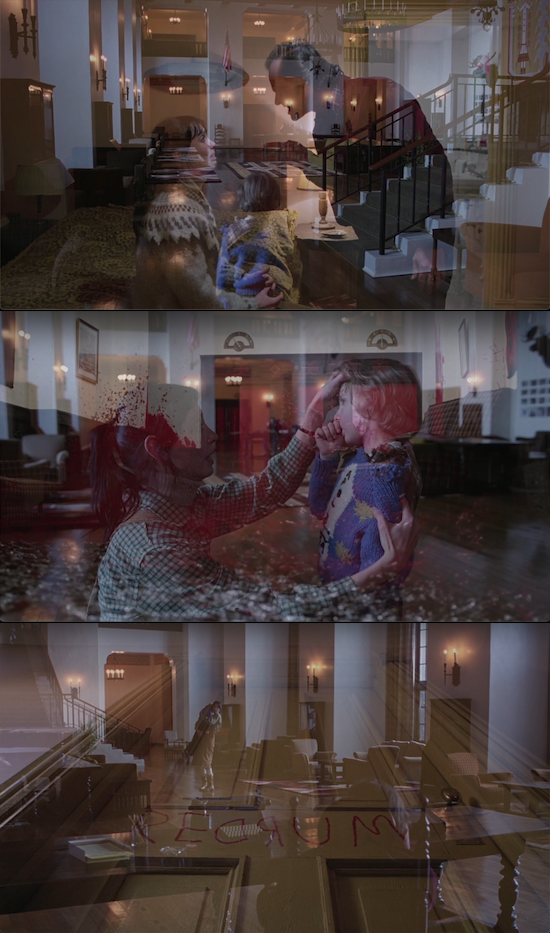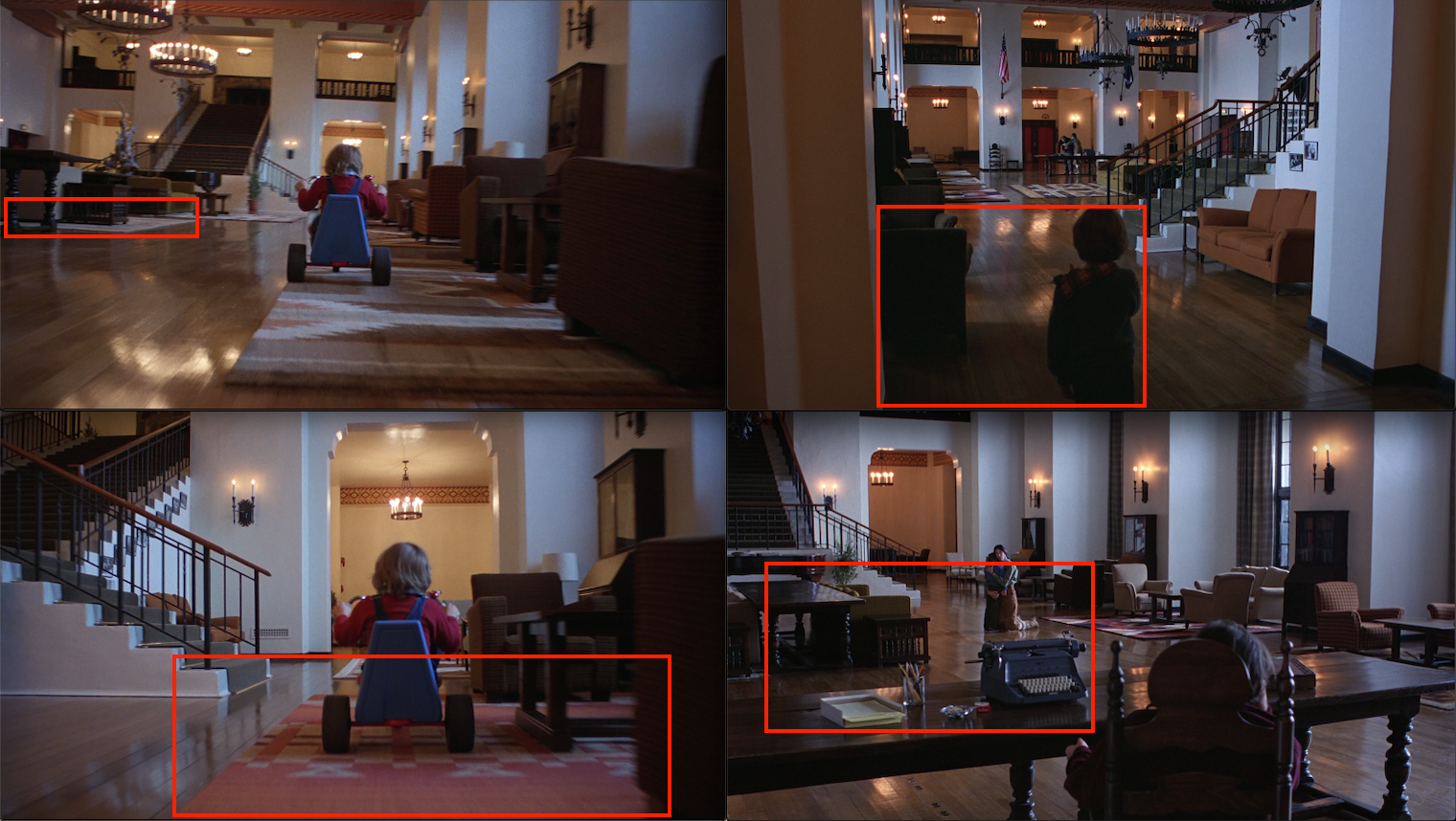As for the mirrorform, I can’t see any strong reason for this. There’s an instance of the missing rug from the third image sharing similar colours to the sweater Wendy’s wearing in the post-237-ghost scene, and the red rug is mirrorformed by a bloodfall vision, and the middle rug overlays with REDRUM. But I don’t know. As noisy as these rugs and other details can sometimes make the mirrorform, removing them doesn’t exactly beautify the image, to my eye. They do improve the look of the forward image, and perhaps that’s the point.