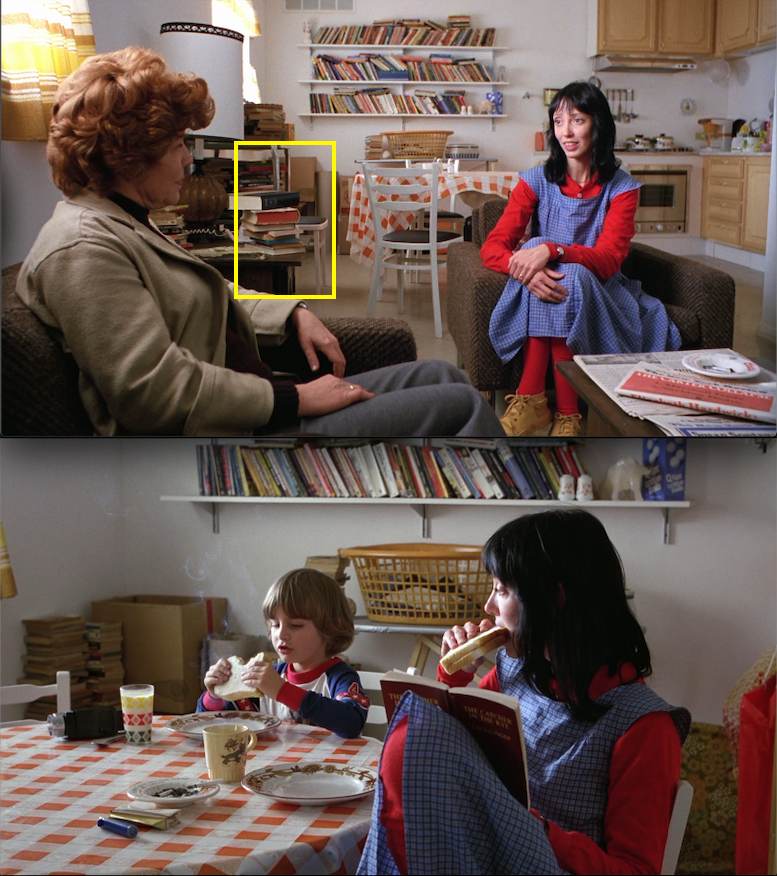 I included the last two shots so you could see how otherwise similar the far bookshelf is between shots. There is a small mystery in whatever that red plastic thing behind Wendy at breakfast is.