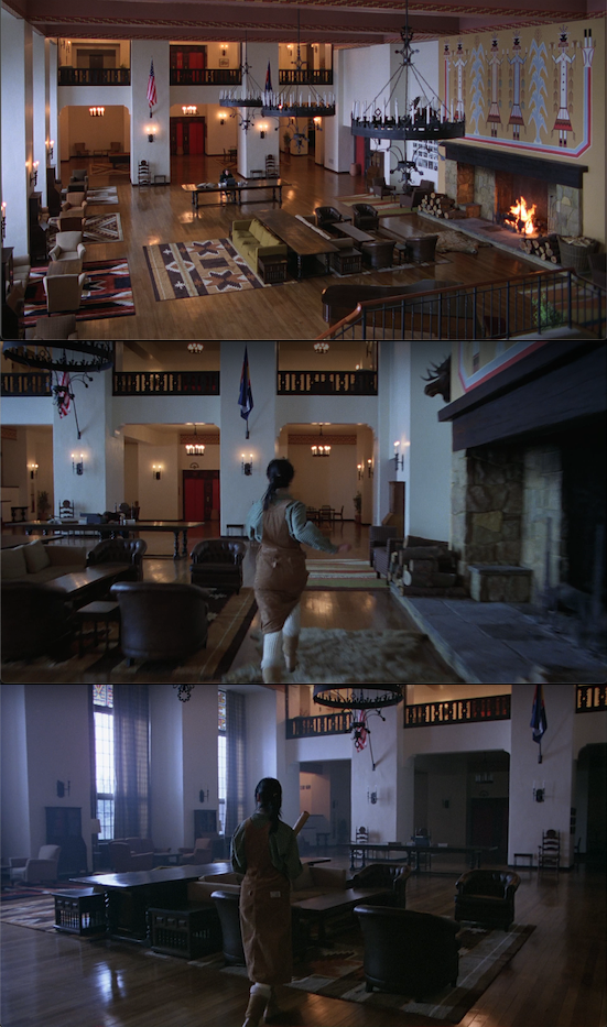I noticed that there’s a red couch that disappears from the lobby, and one that appears where there was none before in the Gold Room. My simple analysis transformed into a deep dive, necessitated by how the appearances and disappearances of these couches in the mirrorform suggests the film may have much more to say about The Wizard of Oz than I previously thought. If that sounds like your kind of crazy, click here to read all about it.