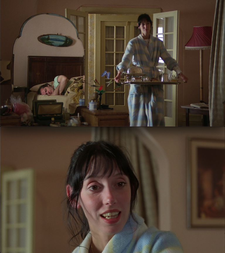 The mirrorform connects this moment to Jack approaching Wendy from the darkness in the lounge. The breakfast scene is Jack and Wendy’s only scene alone together in the film where Jack is acting basically normal and fine. The lounge face-off is the first of his soulless killer encounters with her.