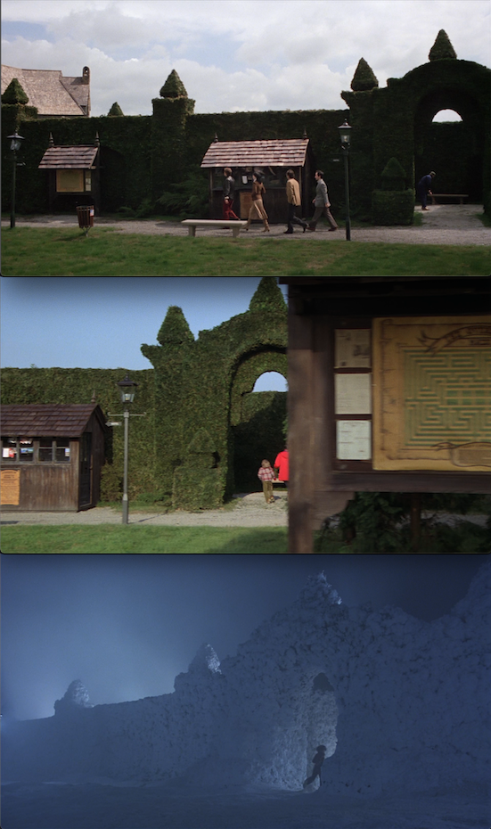 On a similar note, the rugs along the north side of the lounge disappear during Wendy’s creep to fight Jack. This is the only time they disappear. They’ve even reappeared in the shot looking back, when Wendy is scanning for Jack near the typewriter. This shot mirrors with the aerial zoom on the labyrinth. What’s odd about that is that the overlay totally blots out that the rugs are missing. All you can really see is the maze design with a faint Wendy moving through it. So, if the mirrorform was the point, like it seems to be in so many other instances, I’m not sure what the point is, unless it’s another “rug-pull”. Since the maze Danny runs into at the end is a different maze from the one he’s in there. And we’re even seeing in the aerial shot that the maze looks nothing like either of its maps.
