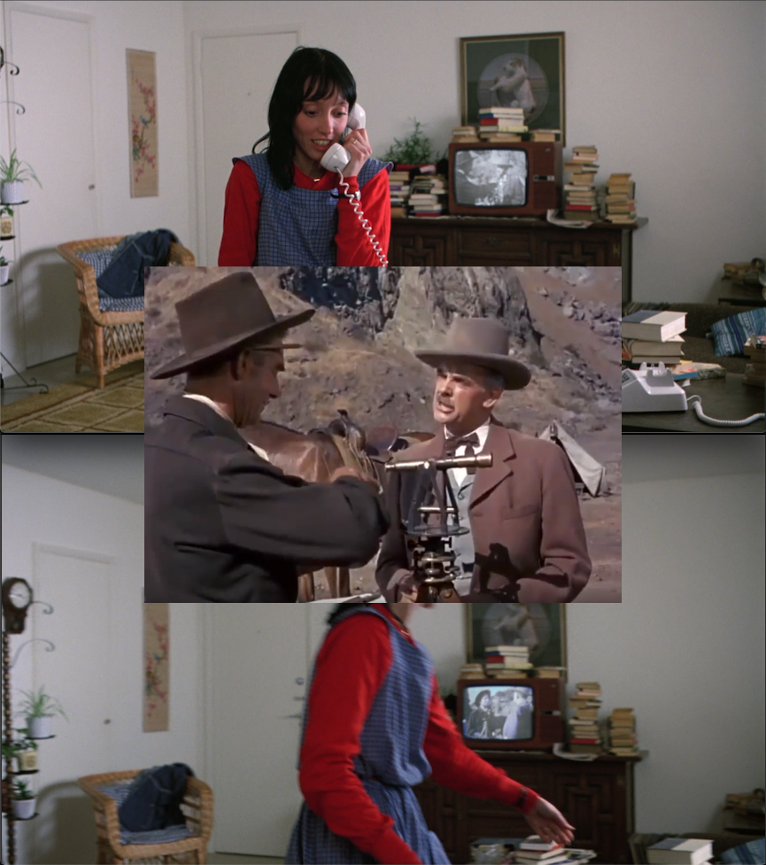 The way Silent Jeff Kincaid (Randolph Scott) says Sharon sounds like “Shine”. Mr. Shine. Two times in the scene the YouTube Closed Captioning translated it as “Mr. Schine”. That pronunciation is kind of incredible (possibly this was meant to reflect the Asian-style banner to the left, which might be by the painter Lang Shining). The Carson City in-movie credits don’t list the character names, so it’s possible Kubrick thought he was being even more clever than he was, there. And if he did know, that’s still pretty clever. There’s also a comparison to be made between the stance and attitude of the men in the film and Ullman and Watson, who are standing in the exact same position behind Jack (see below), though on his opposite side. I’ve placed the Carson City image almost exactly where it would appear behind Wendy.
