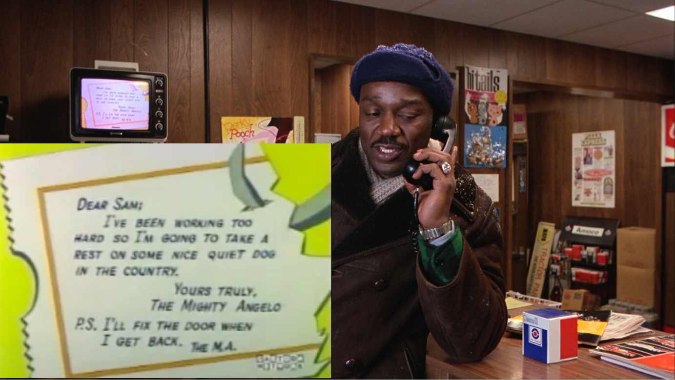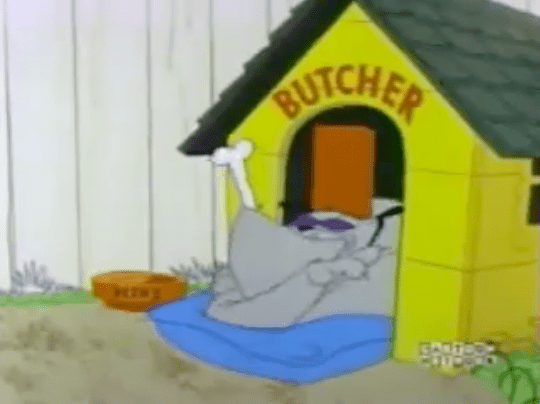 He then tries to frame the nice dog so that the dog catcher will take him away, but Angelo reverse-frames Butcher, who gets taken away. Angelo then puts up an antenna on the nice dog and watches an episode of “Glassie” from his hammock.