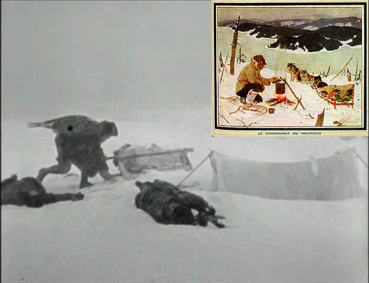 Chaplin’s film, however, took its inspiration from two things: The Klondike Gold Rush and the Donner Party cannibals. An early gag is Chaplin being shadowed by a mountain bear. His cabin mate, Big Jim, hallucinates that Chaplin is a chicken from hunger, and pursues him briefly with an axe (and a lot of gold rush art involves axes, I’ve noticed). Chaplin’s eventually saved by a bear, which they shoot to make food. The female lead has the same name as her character: Georgia (like Jack and Danny). Chaplin steals Georgia away from the brutish, hostile, and possessive Jack, and they dance beneath two fox furs. Jack tries to fight, and is knocked out by a giant clock that falls off the wall. There’s a trapper’s camp, which is passed by a dogsled team (just like in the Gagnon painting; see above). A horse pays him a visit. There’s a ruse Georgia pulls on Chaplin about coming to New Year’s (a date referenced on the Playgirl), and he hallucinates a long dinner sequence with them (sort of like Jack’s hallucinations). In fact, Georgia stays with Jack, but then feels bad and goes looking for Chaplin. She misses him, which makes her slap Jack, and ditch him. Jack mistakes the fact that his house is teetering off a cliff while being hungover. Big Jim chastises Chaplin for having “no psychology, no control”. That’s about all the loose connections I can see between this film and that, which are not few, but I do somewhat doubt Chaplin’s film had a huge impact on Kubrick’s themes or technique.