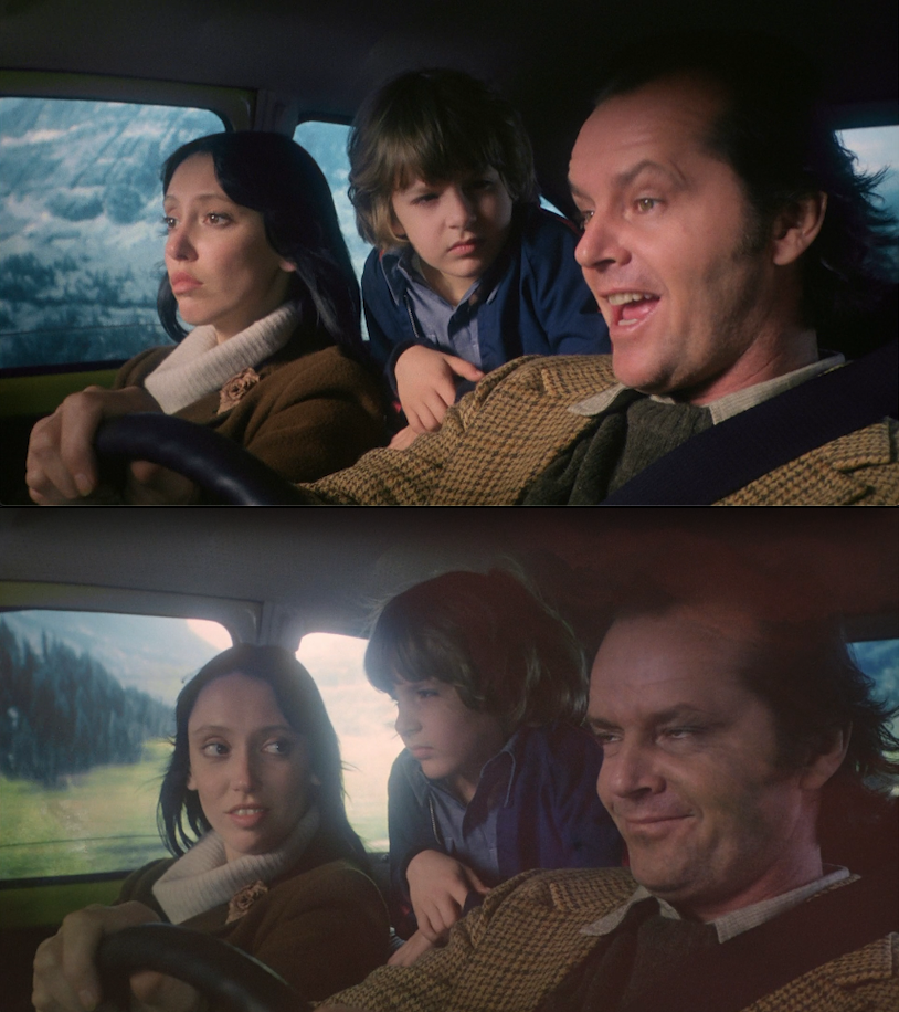 …and the mirrorform moment where Jack is saying “Come out, come out, wherever you are” has that red lamp (middle left), which is very similar to the one in the show pictured below it, and the show also has a sequence where the two conspirators are driving with the woman they kill seen between them here (bottom right), and Danny’s the one Jack and Wendy are ostensibly going to the Overlook to murder.