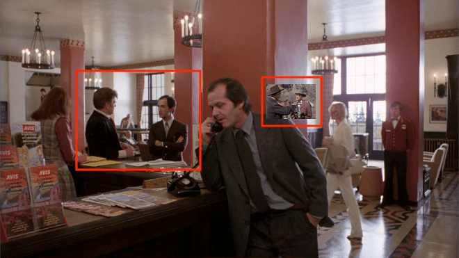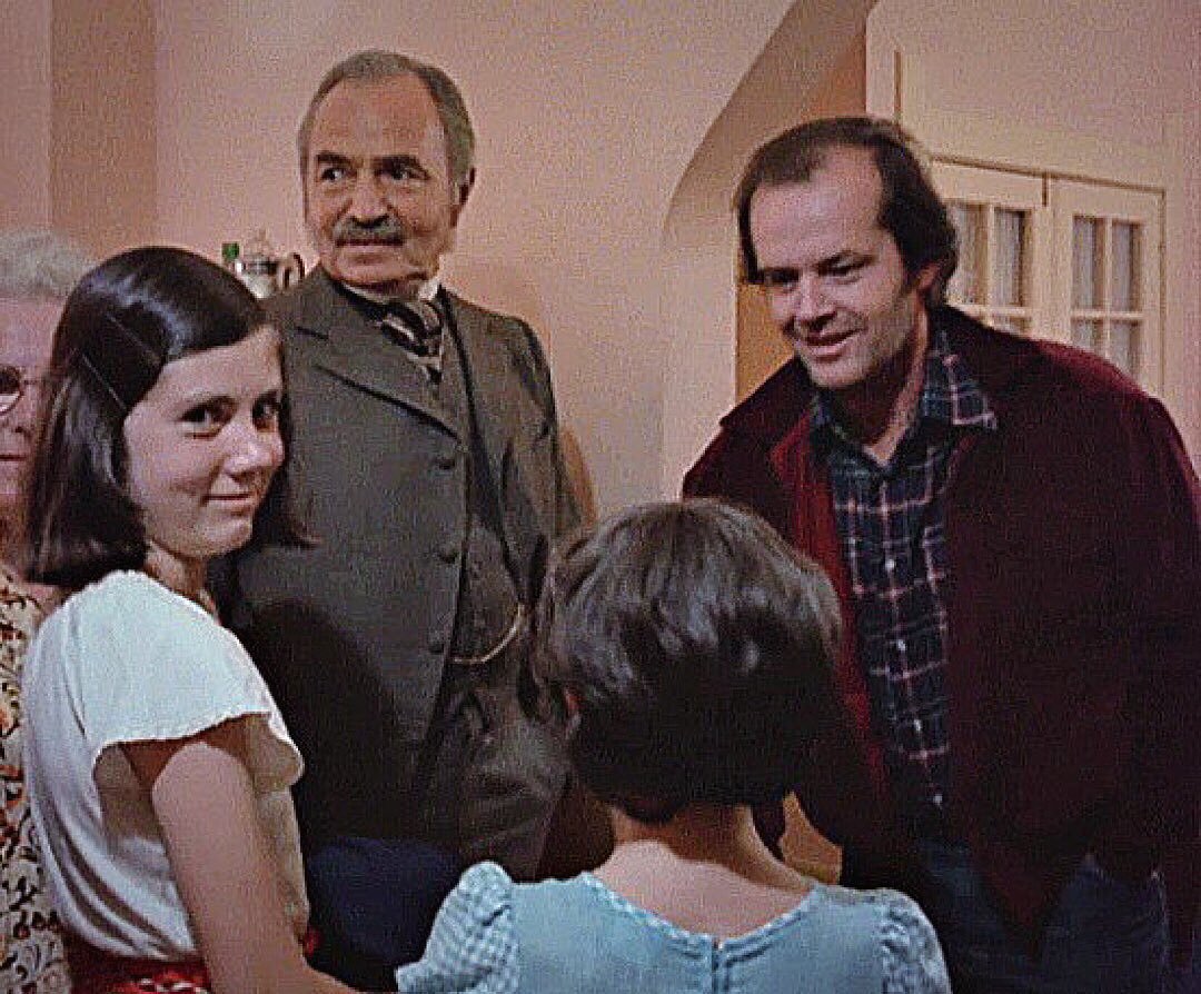 His next phrase is “Come out, come out, wherever you are…!” This was a song from Glenda the good witch in The Wizard of Oz, but it’s also the name of an episode of the anthology TV-movie series Thriller. And when Jack first appears in the film, a woman named Aileen Lewis appears in the background. She was nicknamed “The Duchess” for her regal bearing, and appeared in the background of many things, to lend an air of aristocracy/royalty. Well, she appeared in another episode of Thriller called The Next Voice You See (AKA Look Back in Happiness), and there’s a lot more to say about that, but essentially I suspect Lewis’ presence, along with the trivia that Kubrick apparently hated The Wizard of Oz, supports the latter connection. That said, since Glenda is summoning munchkins out of hiding to meet Dorothy, it still works as a subtle reference to Tony, or even the ghosts of the hotel.