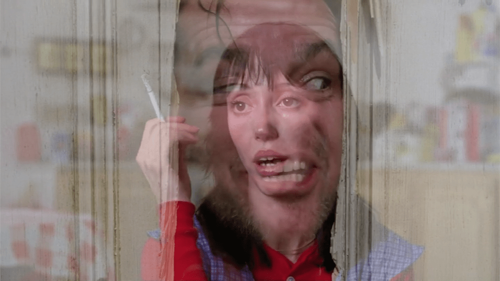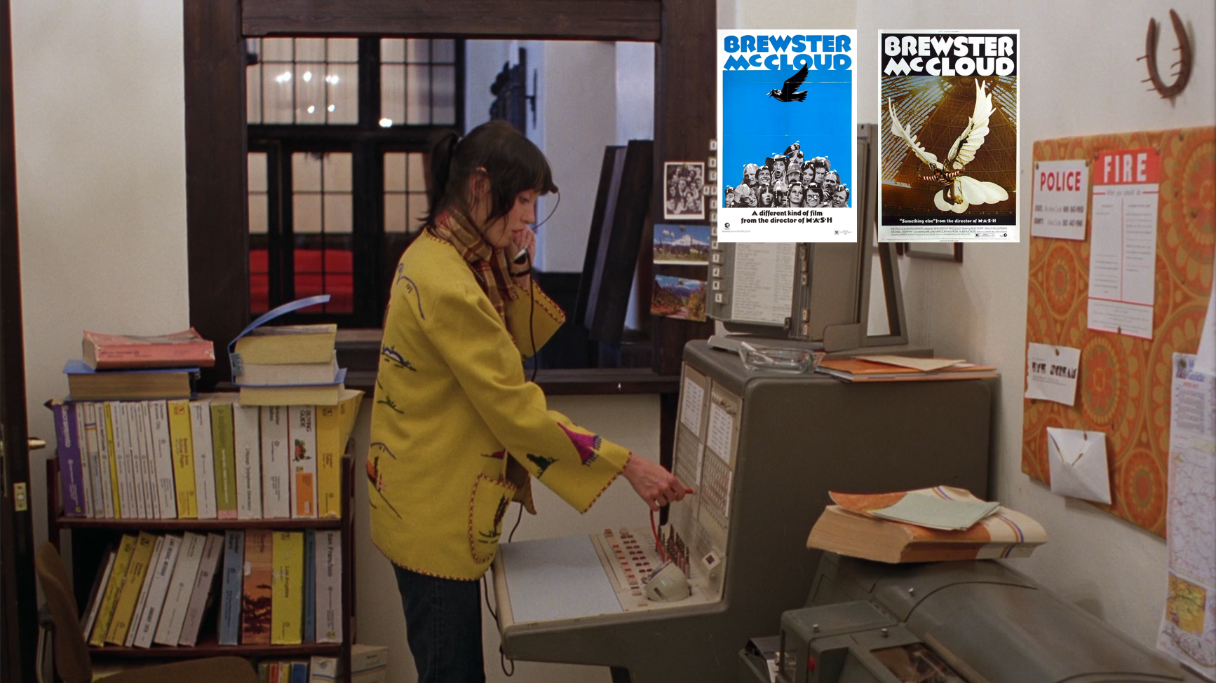 - Brewster McCloud: Shelley Duvall’s first movie was this 1970 Robert Altman comedy about Bud Cort designing wings (while living in a large, abandoned building) so that he can fly, like Icarus. In Kubrick’s acceptance speech for his lifetime achievement award from the DGA, he gave a short speech about how he feels that the Icarus myth isn’t about not flying close to the sun, but about designing better wings. As you can see in the image below, the blue poster for the film features a face collage like the one hanging beside a frustrated Duvall.