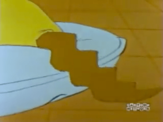 And speaking of other cartoons, the first breakfast has Tom and Jerry and the Bugs Bunny on Danny’s shirt, while second breakfast only has Pooh bear. What’s strange, perhaps, about the Bugs shirt is that he never appears in full view. Only the Bugs plushie is seen fully (along with the only other appearance of the Pooh bear).