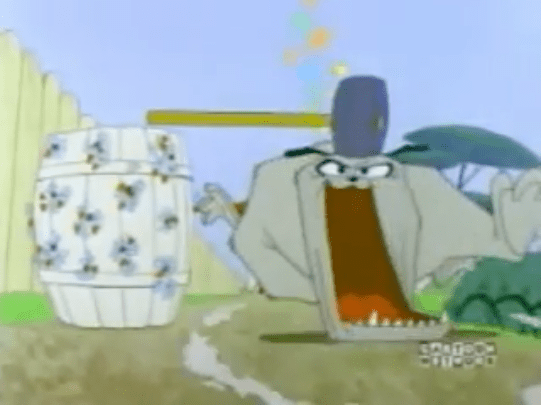 As for Tom and Jerry: at first we only see Tom, but when she puts the mug down, she reverses it, and Jerry is also revealed, slamming a large hammer down upon his nemesis.