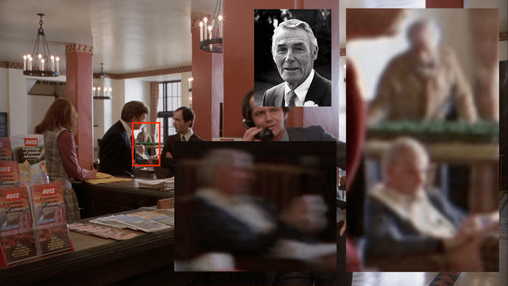 One last thing: as we’ll discuss later, I have a strongly supported theory that a TV movie called Come Out, Come Out, Wherever You Are was a major influence on The Shining. Not only this, but several of the actors from that film seem to be the background actors in the lobby. So, is it possible that Randolph Scott is one of the old men seen behind Ullman and Watson here? The other can’t be Larry Keating (Mr. Sharon), who died in 1967. But perhaps both these men are from Carson City.