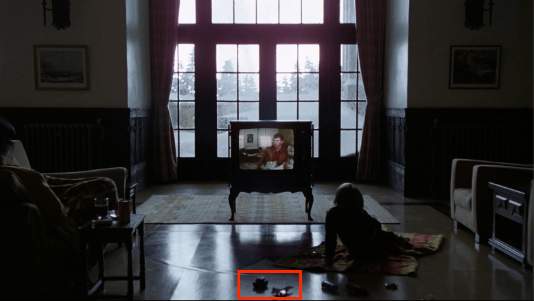 There’s an interesting symmetry to the way TVs and shows appear. The first and last are offscreen being watched (red box), the next two in are behind the person talking on a phone (orange box), the next two in are news broadcasts being watched by Danny’s two major guardians and both programs are discussing a coming blizzard at length (yellow box), and the the middle two instances are on the lobby TV (green box). Also note that the Overlook kitchen (Hallorann’s domain) and Durkin’s Garage both have the tiny white TV, while Hallorann’s Miami place, the Torrance Boulder apartment, and the Suite 3 apartment all have the same model of red JVC.
