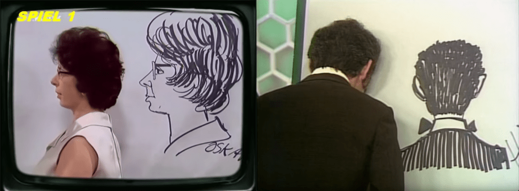 This was Maxi Böhm. He made four appearances on the show, this being from his second. Böhm also parodied an episode of Dalli Dalli on his satirical program Cabaret-Cabaret (1972-74), on the sixth episode. The host of Dalli Dalli, Hans Rosenthal, appeared as one of the contestants in the parody. You can watch the entire parody here, and even though I’ve only scanned through what’s available online, I could easily tell just how thorough and concise this parody was. So you’ve got one two with a doubling name (Cabaret-Cabaret) parodying another show with a doubling name, and in the parody, you have Bohm pretending to be Rosenthal, and Rosenthal pretending to be a contestant. That’s a lot of alternating doubles already. But we can add to this the fact that the Overlook hotel has (as many as) three cartoons by Hans Bierbrauer in it, and Bierbrauer appeared on many episodes of Dalli Dalli, usually just for a few minutes, doing speed drawings, which included doing a speed drawing of one of the contestants. The contestants were always famous actors and similar personalities, so perhaps this wasn’t as hard as it might’ve seemed. Still, an impressive talent. Below you can see an example of Bierbrauer’s skill in action beside the parody from the Böhm episode.