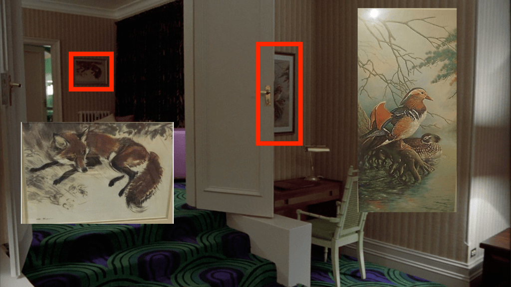 Thompson’s collections bore names like A Brush with Animals, An Artist’s Safari, and Animals Through the Eyes of an Artist. So I think this idea of safaris and zoos might be what’s at contrast here—the idea of how humans interact with the wilderness and with the wild in captivity. Also, there’s a second Thompson piece across from this one, as we’ll see over Jack’s shoulder in a second, whenever we see him reacting to the 237 ghost (in mild fear, in burgeoning lust, and finally in mortal terror). And this follows closely on the two “foxy ladies” hanging over Hallorann’s Miami apartment, which were published by the Old School Inc. So I wonder if this means that zoos and schools are also being contrasted here. Jack is, after all, “formerly a school teacher”. Did he trade a school for a zoo? Is a zoo like a school for animals? Do people hate schools and zoos for the same reason? Perhaps because of their attempts to civilize their respective species?