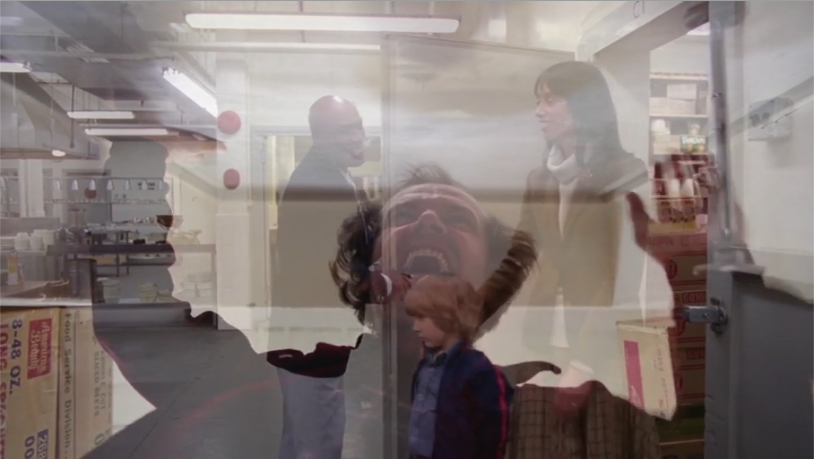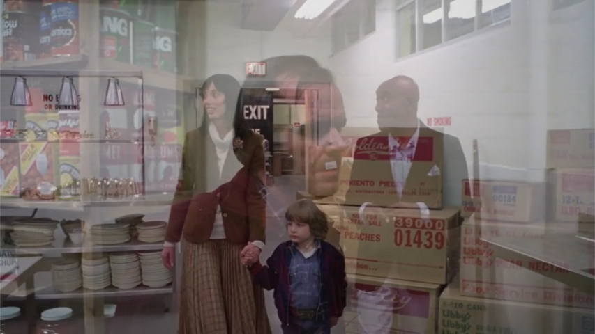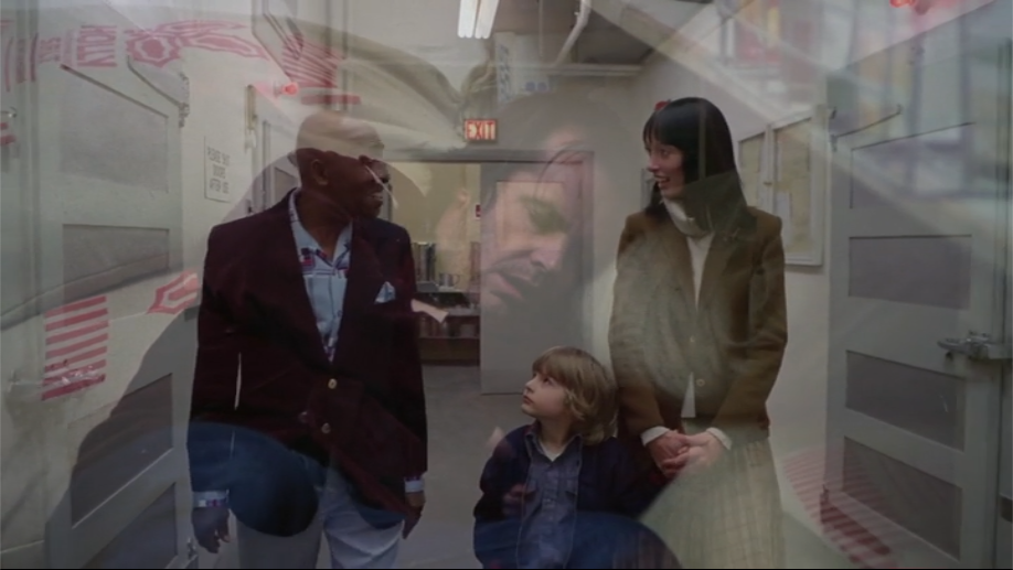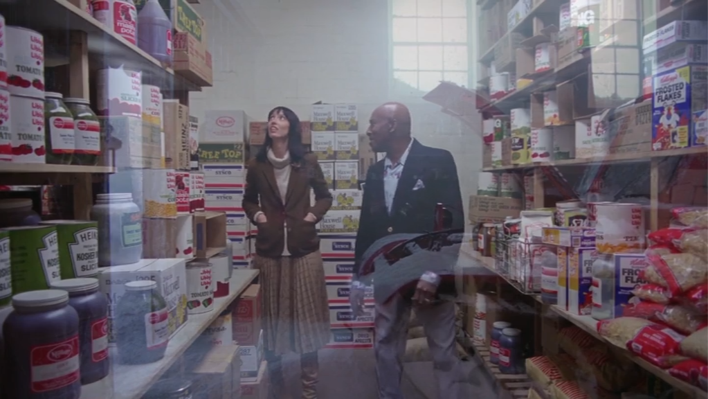 - Just wanted to point out how we can still see the clams, Golden Rey and Corn Flakes boxes. But also, as Wendy comes out of the hotel, here, there seems to be an umbrella stand here, with at least five black umbrellas in it, for convenience. The next time we would see this scene, going backward in the mirror world, would be when Dick re-enters this portal. The black umbrellas have always struck me as a funereal thing, giving a small subliminal bump that someone’s not long for this world. These are seen right before the dead snowcat, and those are seen right before Hallorann gets axed. The last time we see them is when Jack goes to kill Danny, and of course this comes right before we see the Grady ghost, but also Jack’s meat popsicle face. So the fact that the lyric that just happened was “It’s all right” might hint at the fact that Danny shouldn’t feel too guilty that Hallorann died for him. Yes, he could’ve shone to warn Hallorann about Jack’s hiding place, but a) he is just a kid, and b) that could have upset everything that followed, and maybe then Jack choses left instead of right in the labyrinth and maybe Danny gets caught. The universe is an insanely complex place, and we’re not responsible for stopping every bad thing that happens there. Even the ones that directly involve us. And, of course, Hallorann could’ve warned Danny a little more about what to expect during his stay.