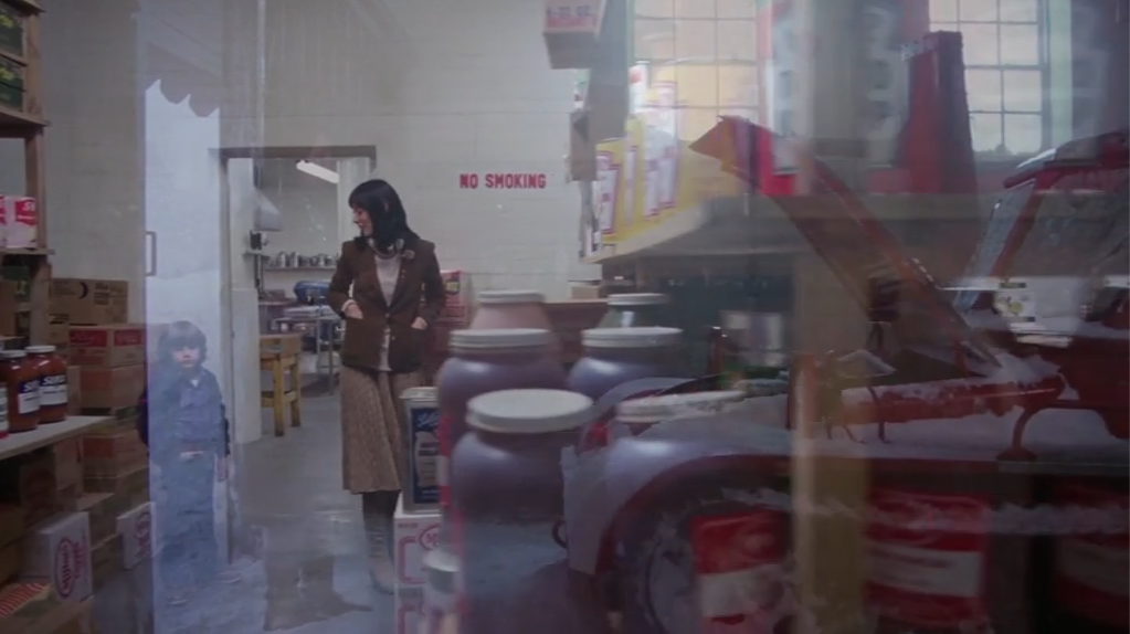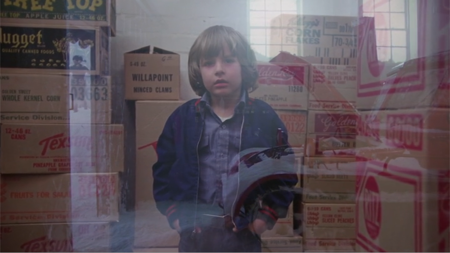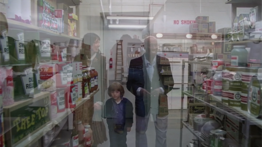 - Going back for a little bit of Beatles trivia: John Lennon’s favourite snack was cornflakes served with cream (which apparently is where the phrase “Sitting on a cornflake, waiting for the man to come” comes from in I Am the Walrus off Magical Mystery Tour, the album that is visible in A Clockwork Orange…but I’m getting ahead of myself). In Hallorann’s long list of items to be found here, he mentions “…cornflakes…” right at this moment, which happens to show Danny standing in a shaft of light from the mirror world, staring off in the direction of the camera crew, for some reason, ignoring his mom’s look as she follows Hallorann. But more significantly, there’s a box of Cornflakes now visible just to the left of Danny’s head, which was obscured by the opening framing of this scene. So it’s only on screen for a second, and only when Hallorann says the name.