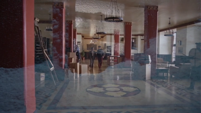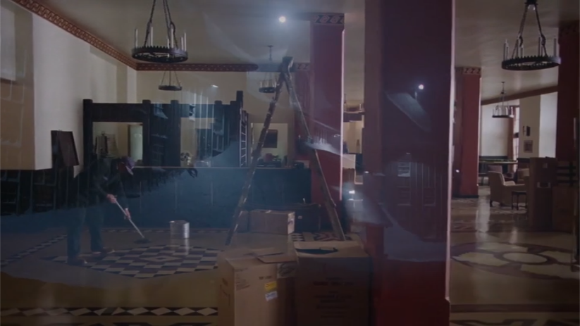 - “Here comes the sun” – As promised, each of the Here Comes the Sun iterations has one moment where a globe of light hangs over the action, at the middle-top of the image. In round 1 it was the deep freeze light above Hallorann, Wendy and Danny. In round 2 it was the 237 bathroom light above the ghost and Jack. And here it’s an exterior light of the Overlook’s, appearing first in this overlay, at the very peak of this mystical, unmanned ladder (note the way it lines up perfectly with the gable in the overlay), which serves no obvious purpose, but to be out of the way, it seems. So if all the film’s ladders are Jacob’s ladder references, this light, and the sun it symbolizes might just be deities. Note too that all the “sun-lights” appear in the forward action in these moments, and that they’re all artificial lights of the hotel (deadlights?). Perhaps this is a comment on the evil nature of these deities. The first one overlooks a bunch of dead meat, the second one overlooks the 237 ghost, and the third overlooks (the Overlook) Wendy getting stuck in the window, and being unable to run with Danny and to possibly encounter Hallorann and get away unscathed. These lights look down on the dead, and that includes the hotel.