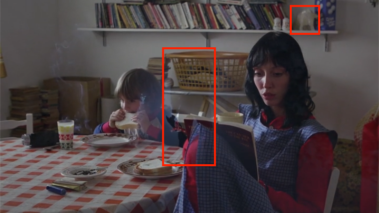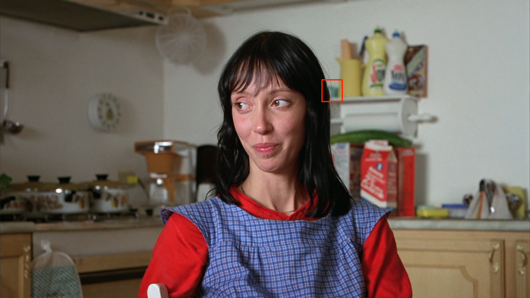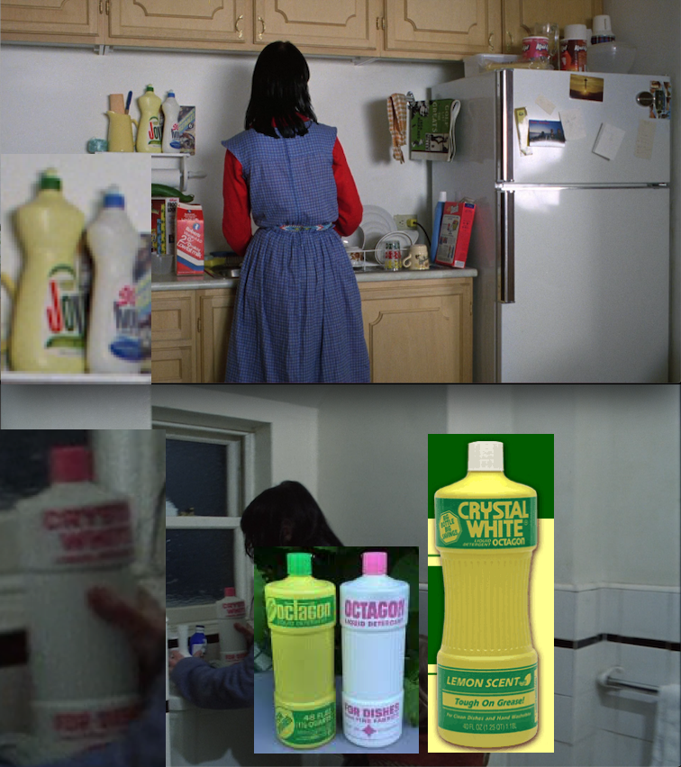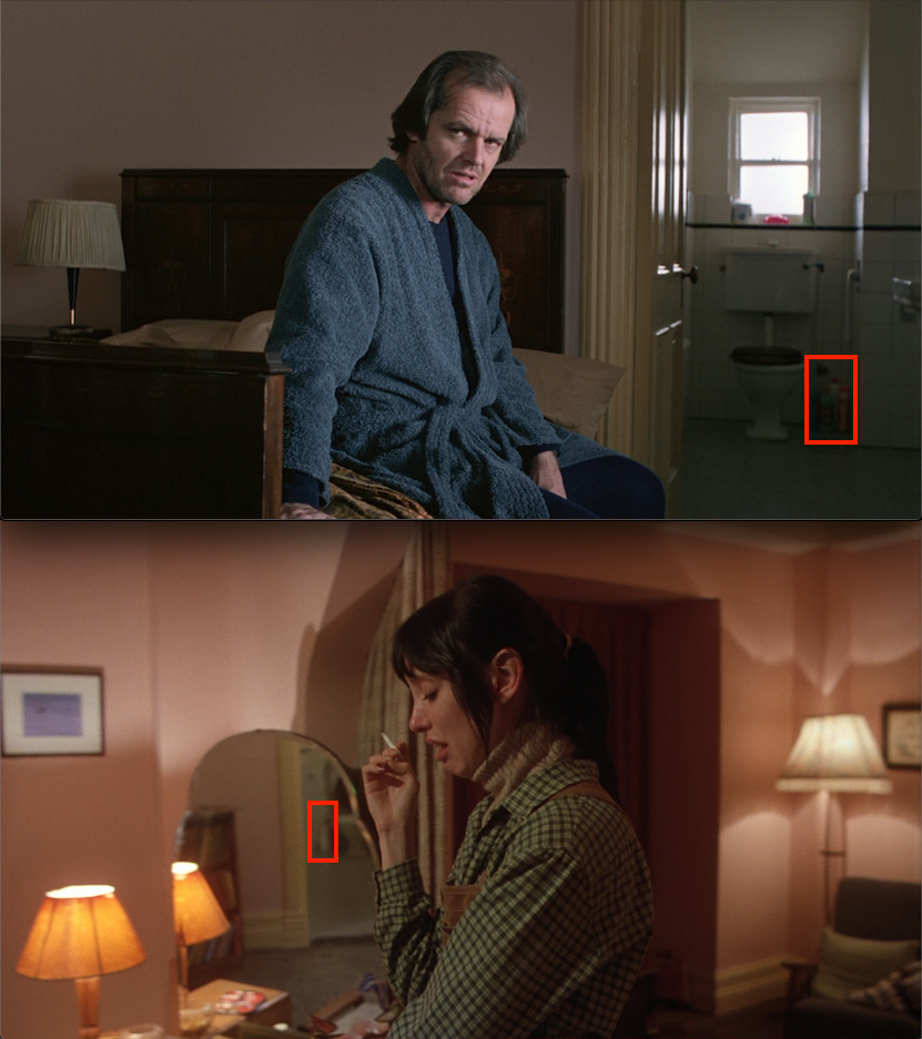 In order to get Danny out the window, she has to shove aside some Crystal White detergent by Octagon. And Crystal White sounds an awful lot like Joy Ivory, the two bottles next to the clew. Is there symbolic significance to this, beyond the connection to the clew? I’m not sure, but there is a strong undercurrent in the film of connections to colonialism, the holocaust, slavery, and the genocide of the indigenous populations of America. Jack quotes White Man’s Burden at Lloyd. So I’ve wondered if the difference between the stationary Joy Ivory that sits behind Wendy during all the Boulder scenes is symbolic of her ignorance of her (meagre) privilege as a white person in America, and the legacy that brought her to her position of power. Extremely minor power, perhaps. But power over non-white people, such that she can wear that Navajo-style belt she’s wearing and not have to know what it means.