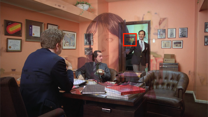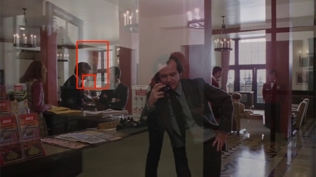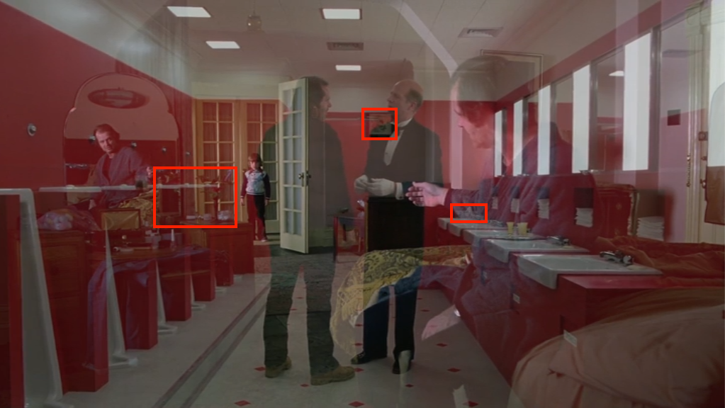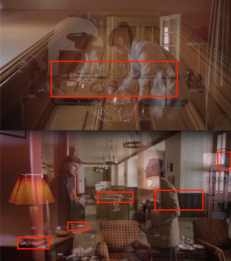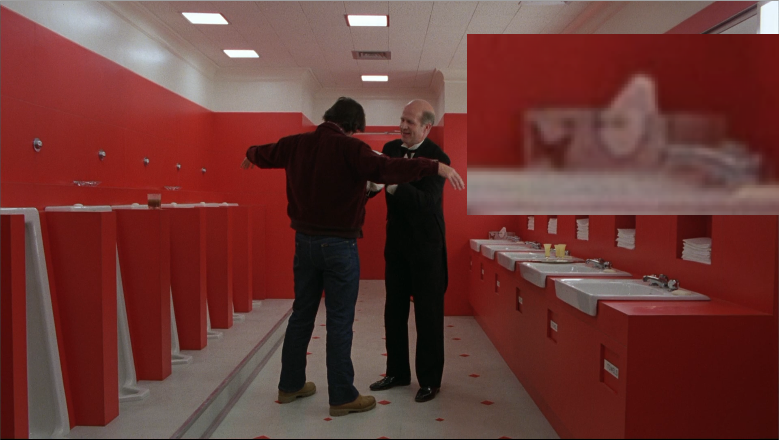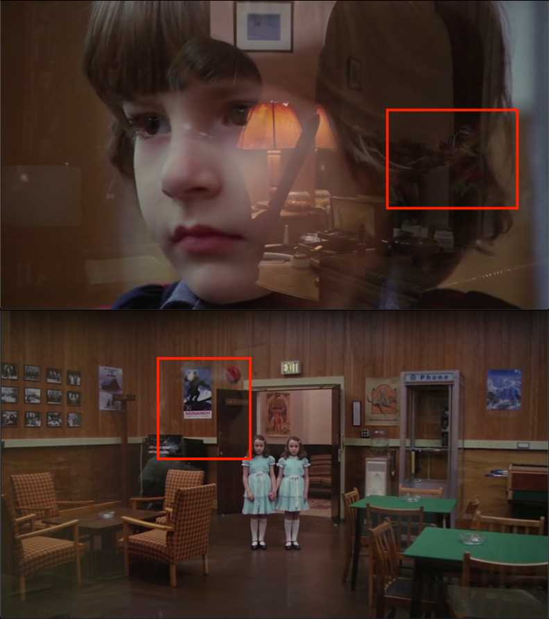 A second later, Flock of Loons passes over the old man studying the model labyrinth in the lobby behind Jack. So if the painting is symbolic of the clew, the mirrorform gives us this moment of it overlapping with someone trying to study the design of the maze. Just as Jack will do later in the film (as his final act of pre-madness).