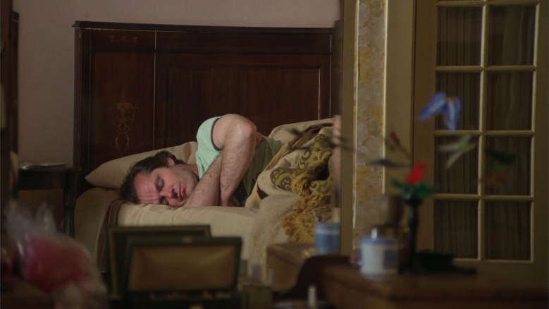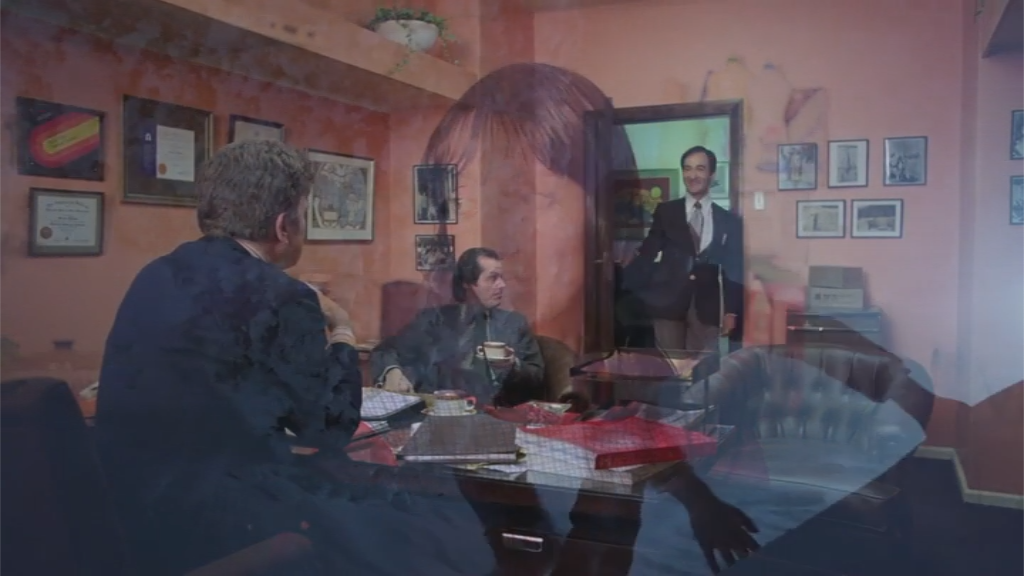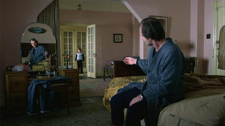 In this moment there’s butterfly imagery on both sides of the film at the same time, forming a triangle. Unless you count bathrobe Jack and mirror bathrobe Jack, in which case it’s a bit of a W.