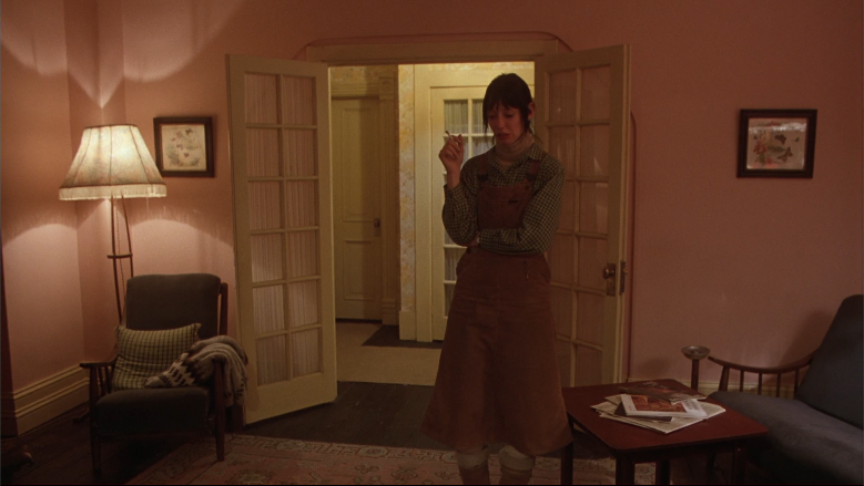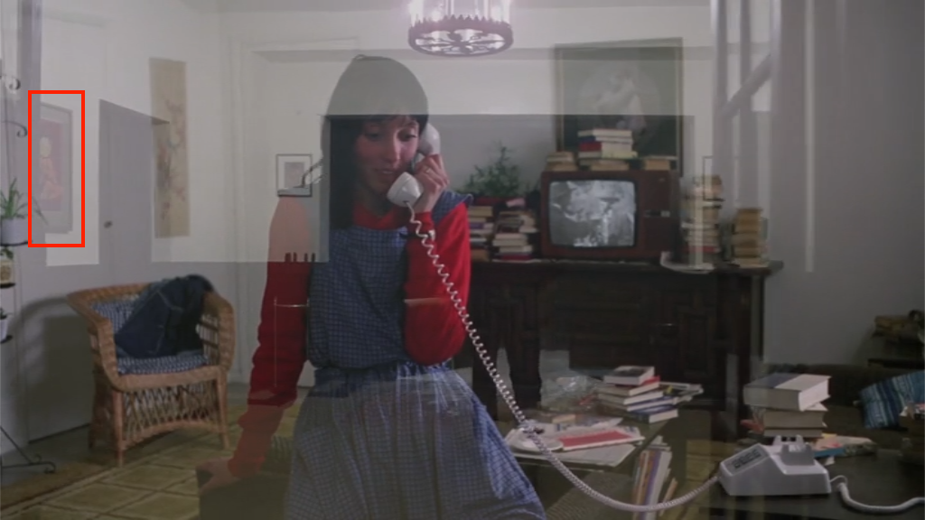 Then, when Wendy is seeing MURDER for the first and last time, the mobile is off to the side, sitting inside tour Jack. There’s also a make-up kit that resembles a butterfly, and our last shot of one of the butterfly paintings in the upper right. Altogether, these create a slash of butterflies across MURDER (which is true without the mirrorform, incidentally).