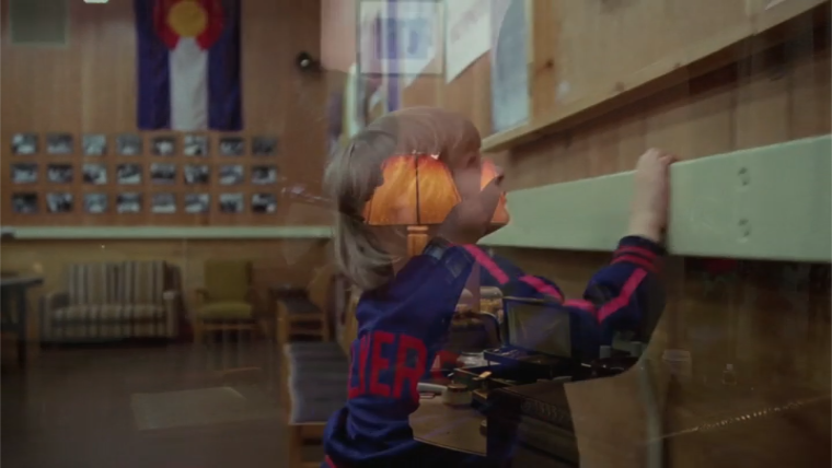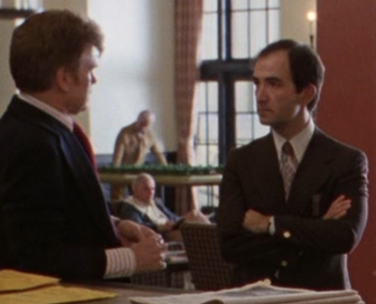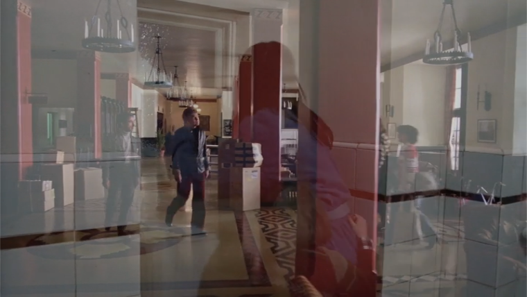 Another is from the way a woman (despite carrying heavy luggage in the opposite direction from the parking lot) says “Goodbye, Mr. Ullman” a moment before stepping behind this red pillar, while wearing a Toronto Toros jersey. Toro means bull, of course, and their mascot was an angry red bull. In fact, as the pillar obscures her, she’s standing right between the pillar and the model maze in the distance. (By the way, it’s possible I’m wrong about this, and the jersey is actually for the Trois-Rivières Ducs, but it’s still very similar to the Toros jersey. It could be a mash-up of both.)