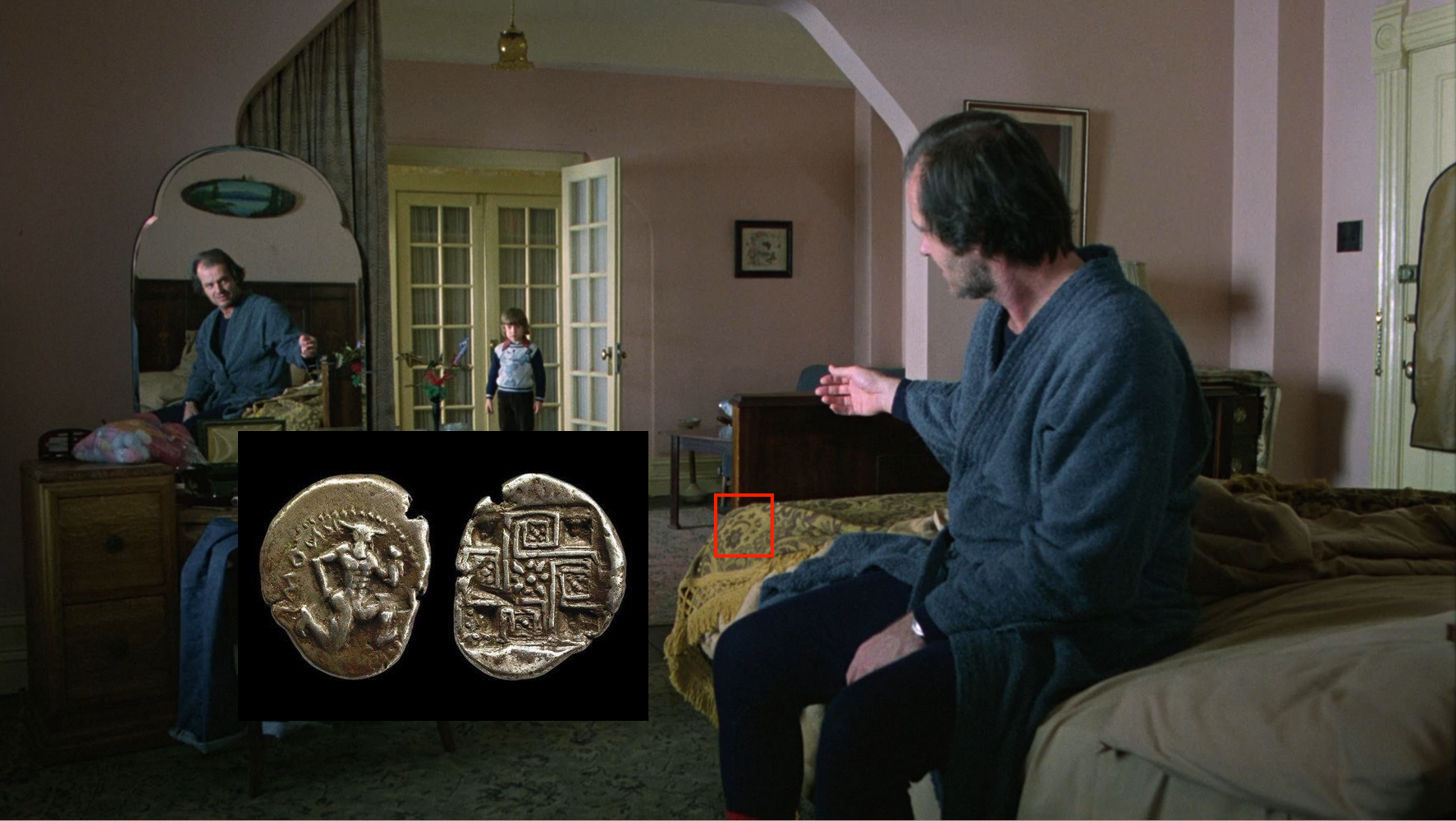 Also, one of the minotaur’s names was Asterion, which means literally “starry”. So some have imagined that the balls that surround the minotaur on ancient coins must therefore be symbolic of stars. I’m not so sure, but if that’s true, there’s a design on the Suite 3 bed sheets of a large flower surrounded by little star-shaped flowers (and a toenail-shape like a slice of moon). This part of the blanket’s design is only fully visible in this one shot (all other shots of the blanket show aspects of this design, some of which are fairly complete, but this is the clearest, fullest view), and it’s here, in the one scene Jack and Danny have alone together.