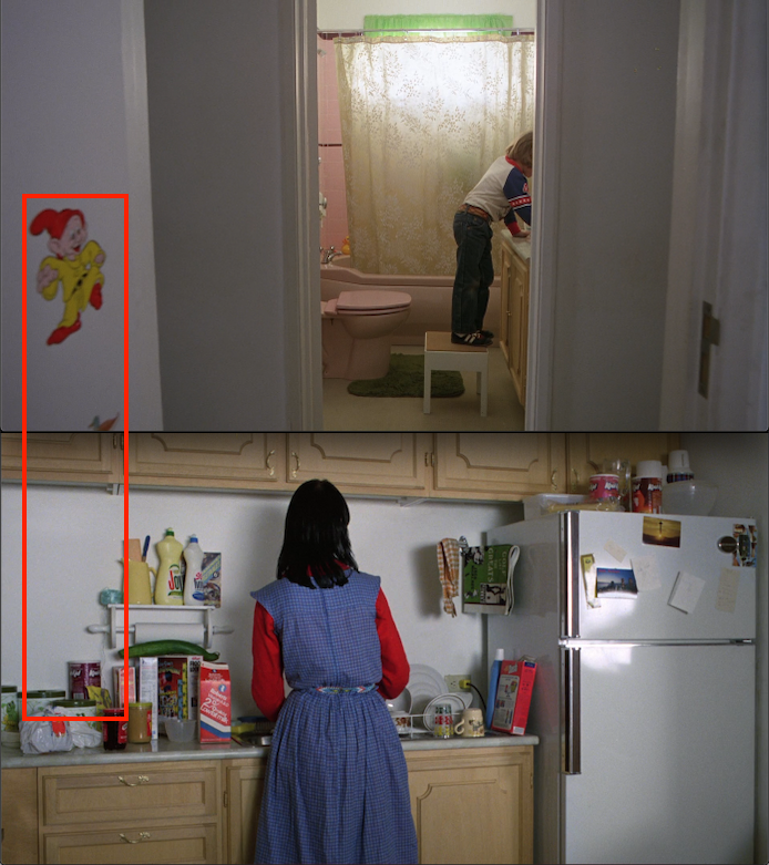 One last thing about clews. While it’s not absolutely exact, when the shot cuts from Danny’s door to Wendy’s kitchen, the thing that’s in roughly the same spot as the clew (it’s just passed over the exact same spot) is the Winnie-the-Pooh-coloured Dopey sticker. I’ve described how Danny’s door and Snow White and Winnie-the-Pooh relate to Danny’s survival too many times to want to do it again here. But I would be remiss if I didn’t point that out.