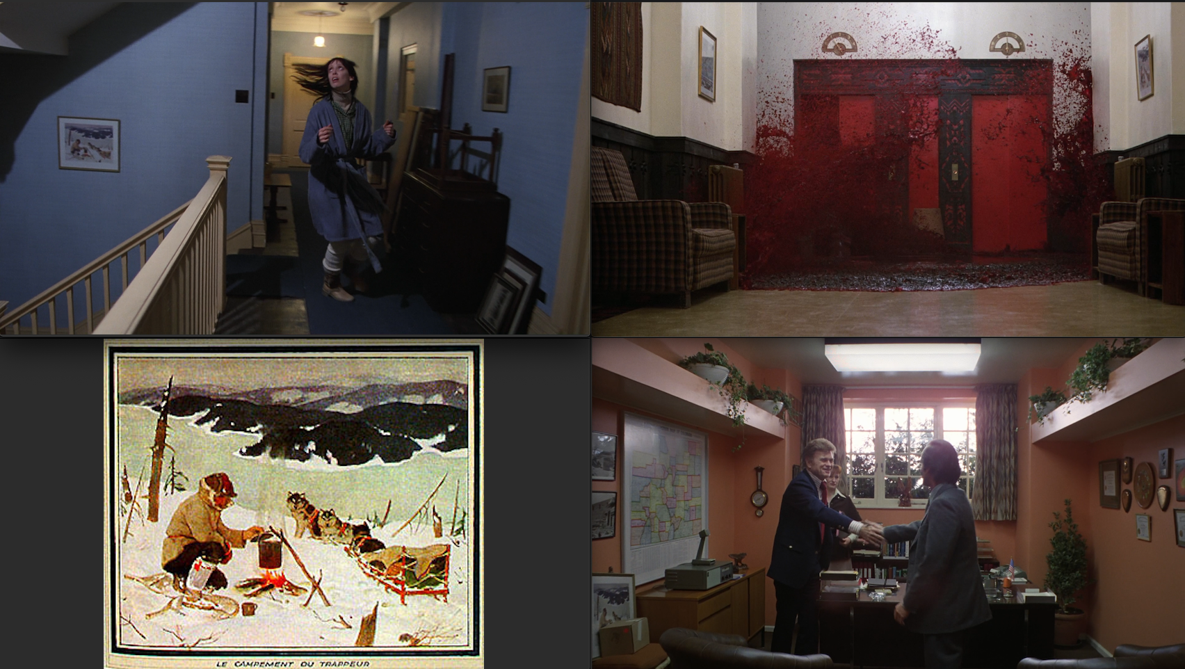 Here, Wendy is seeing the Grady ghost while Ullman is telling the Grady story. The art in this hall, which will actually be repeated in the bloodfall hall, is largely by the Group of Seven, Canadian painters, many of whom got their starts as painters in the first world war, and whose art was later used as post-WWII propaganda to promote a more idyllic view of the world, I guess, or to promote Canada’s natural splendour.